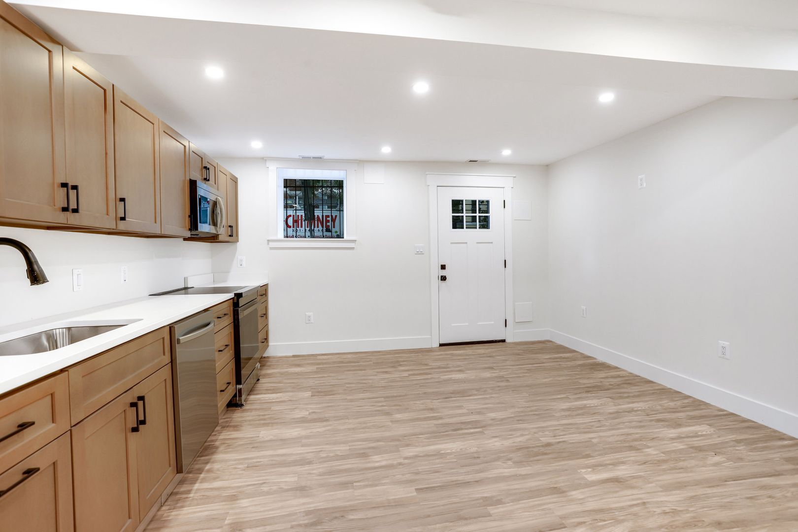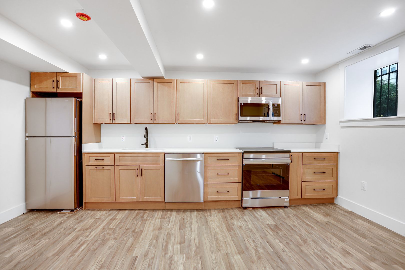 • Sleek kitchen with white counters & stainless steel appliances