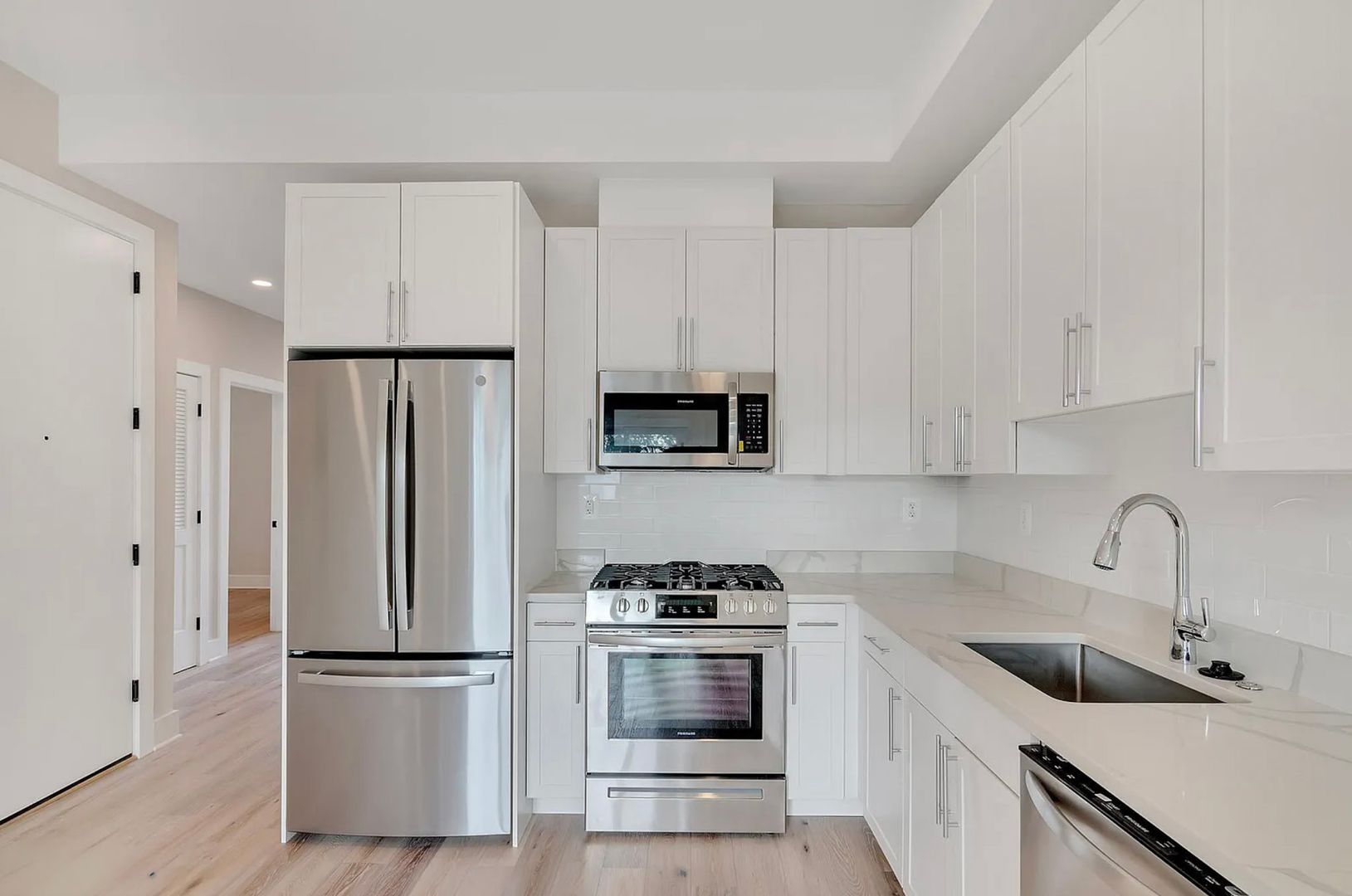 • L-shaped spacious kitchen with plenty of cabinet storage and stainless steel appliances