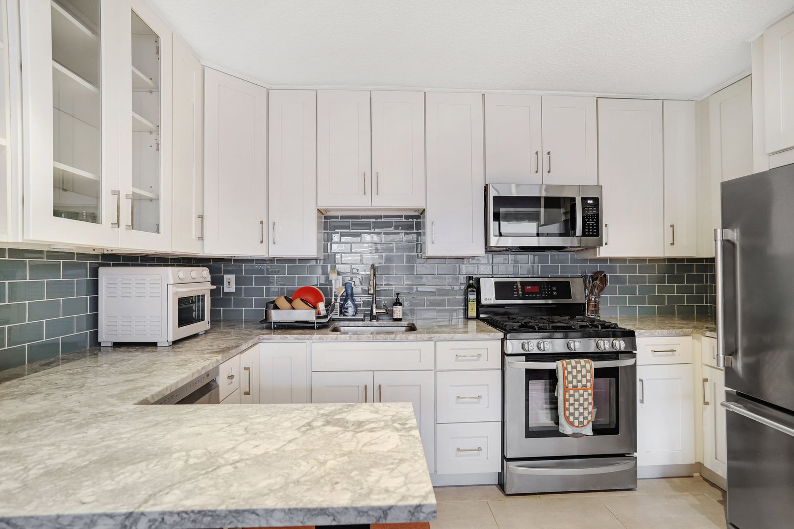 • L-shaped kitchen with plenty of cabinet storage and stainless steel appliances