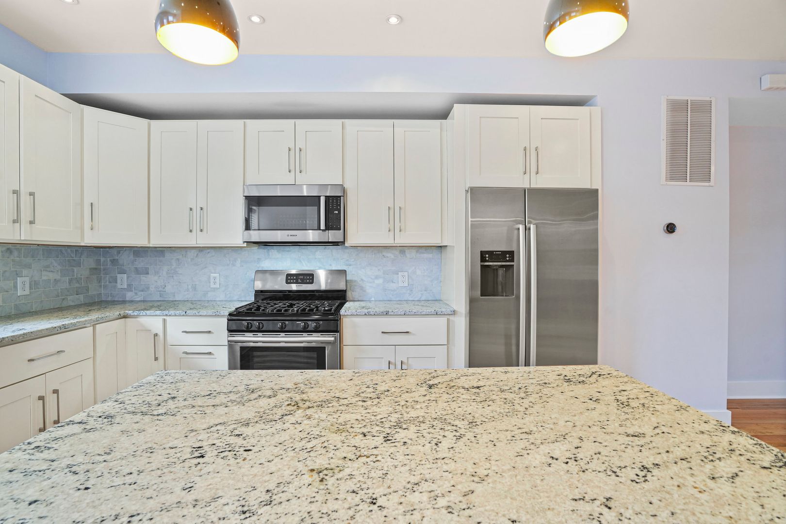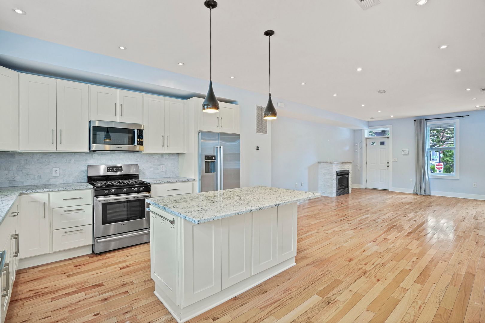• Spacious kitchen with granite counters, island, and stainless steel appliances
