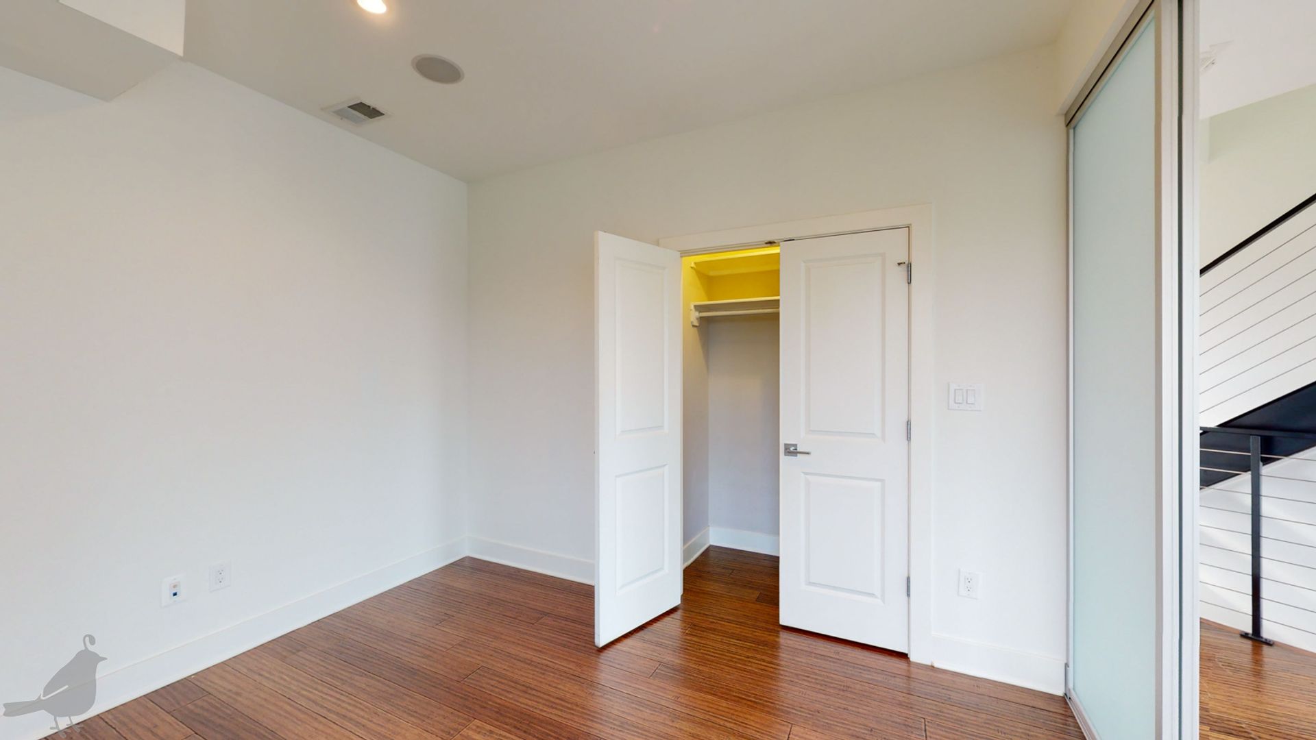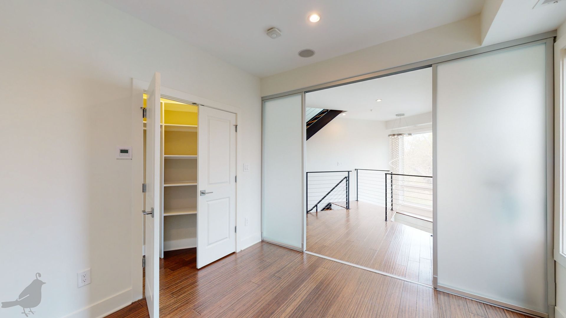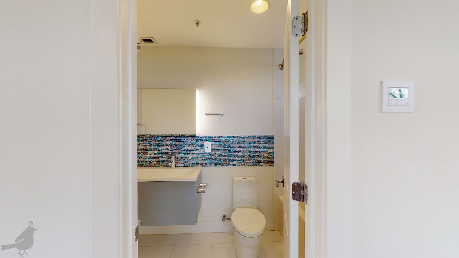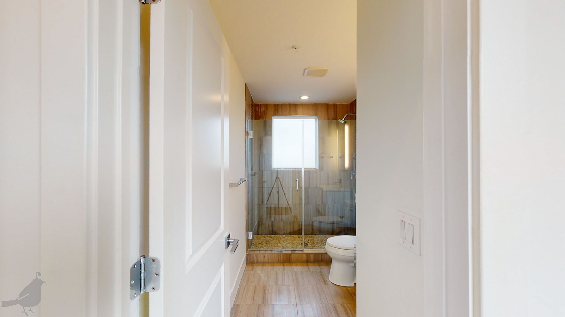On the second level of the home, you'll find the home's second bedroom with frosted sliding glass doors, and a large window, which can easily be converted into your home office. Nearby is the guest bathroom with a large glass-enclosed walk-in shower. Down the hall is the third bedroom suite, spacious enough for a queen size bed, containing dual closets, and completed with an en-suite bathroom and double vanity. The home's in-unit washer and dryer are conveniently located on this level.