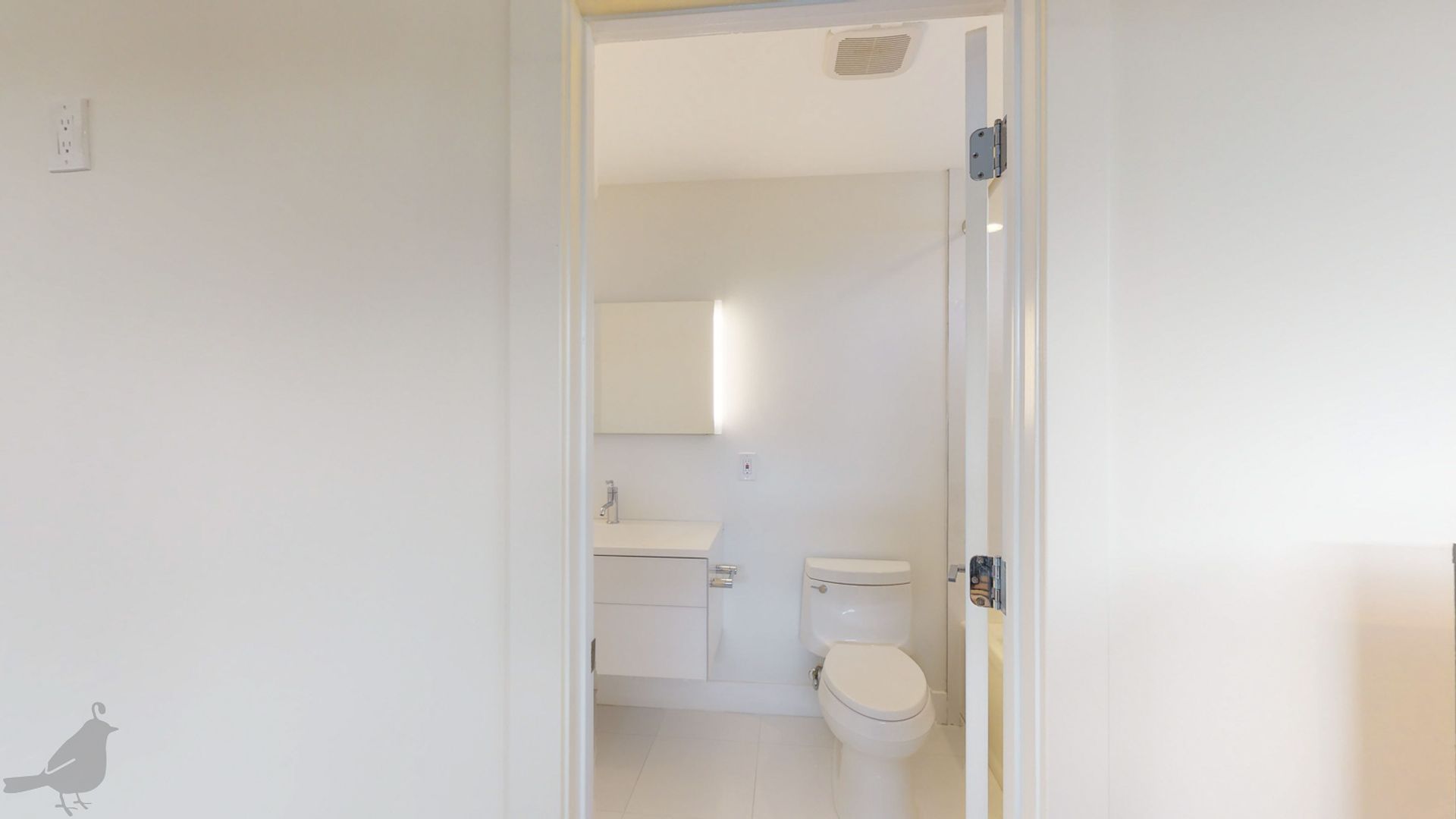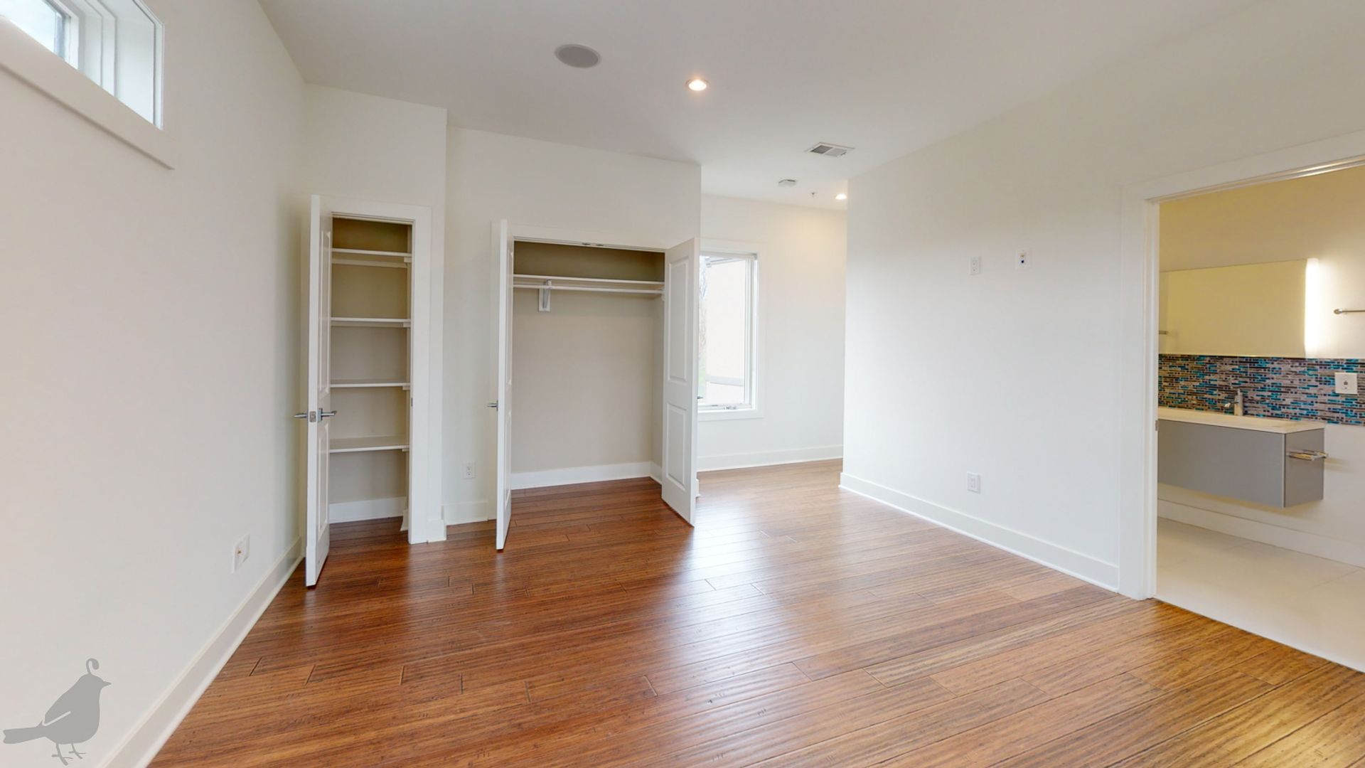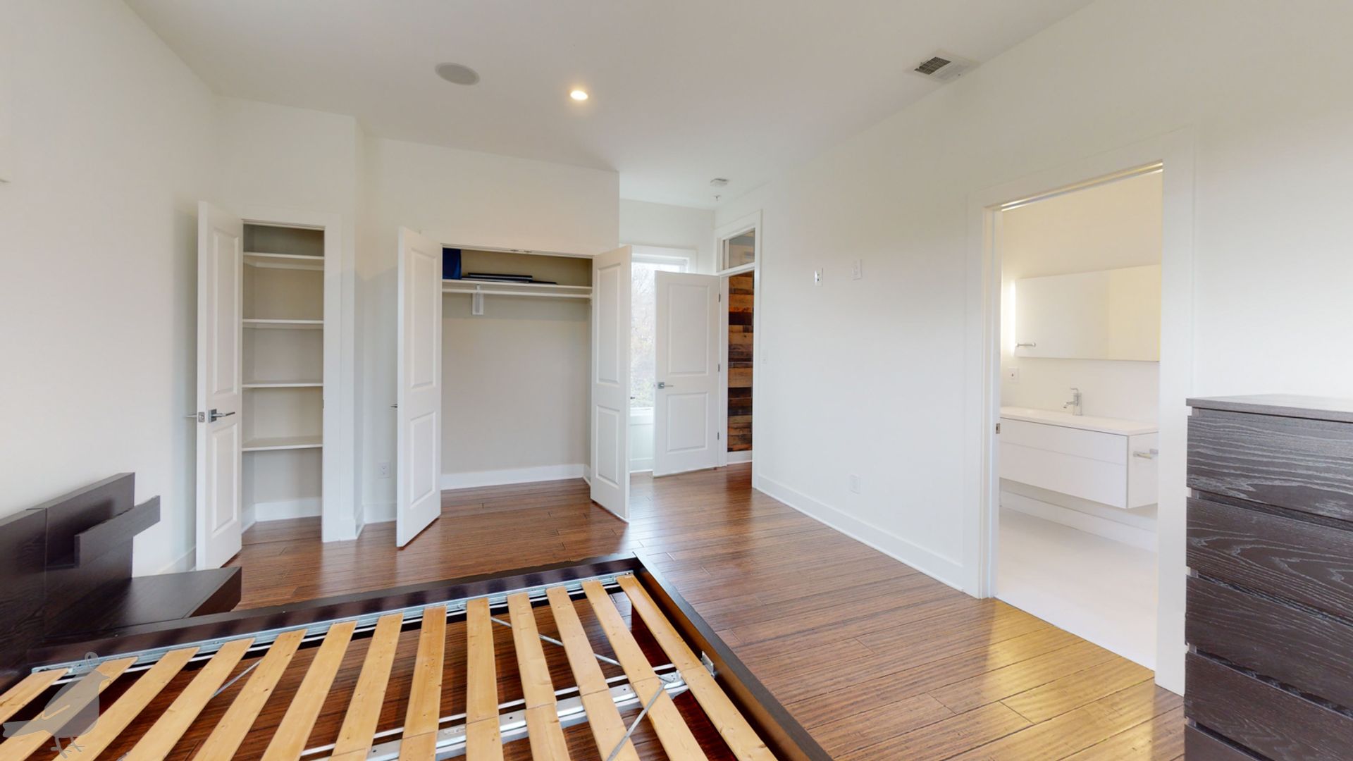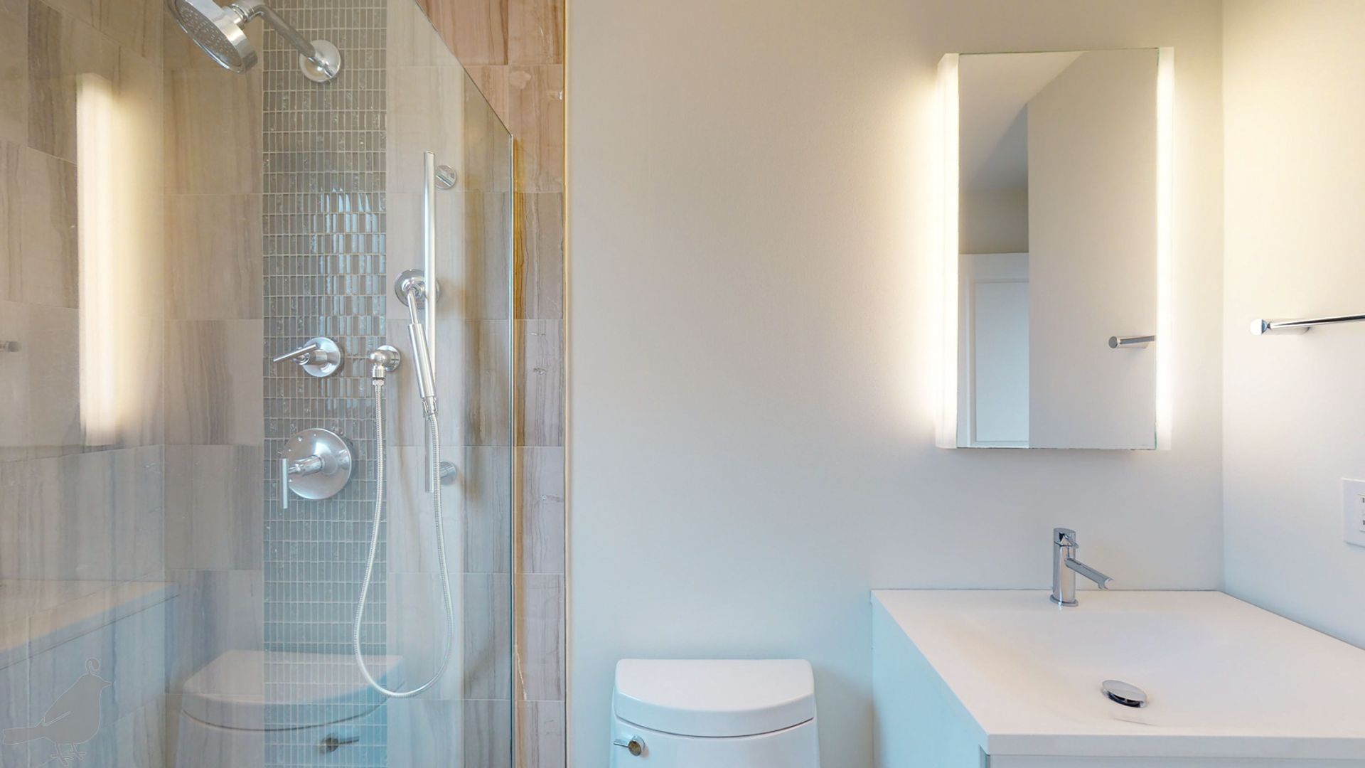 On the second level of the home, you'll find the home's second bedroom with frosted sliding glass doors, and a large window, which can easily be converted into your home office. Nearby is the guest bathroom with a large glass-enclosed walk-in shower. Down the hall is the third bedroom suite, spacious enough for a queen size bed, containing dual closets, and completed with an en-suite bathroom and double vanity. The home's in-unit washer and dryer are conveniently located on this level.