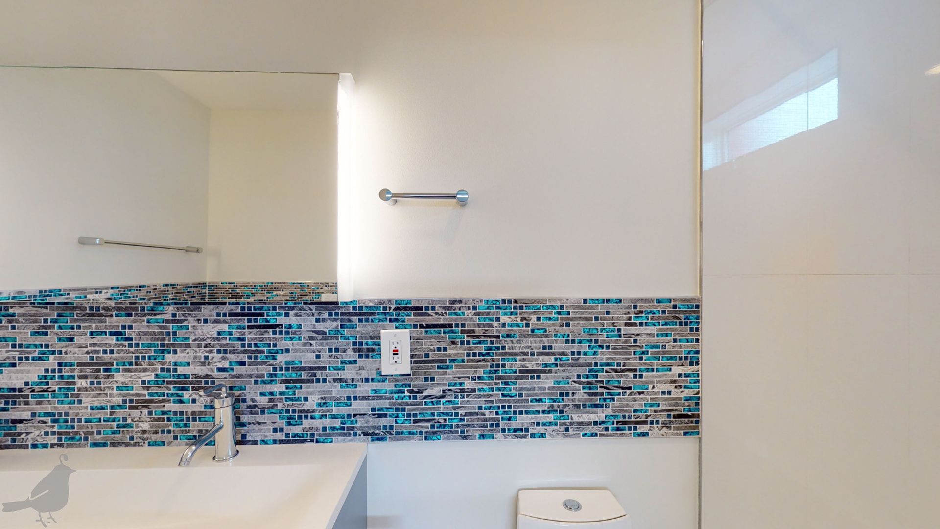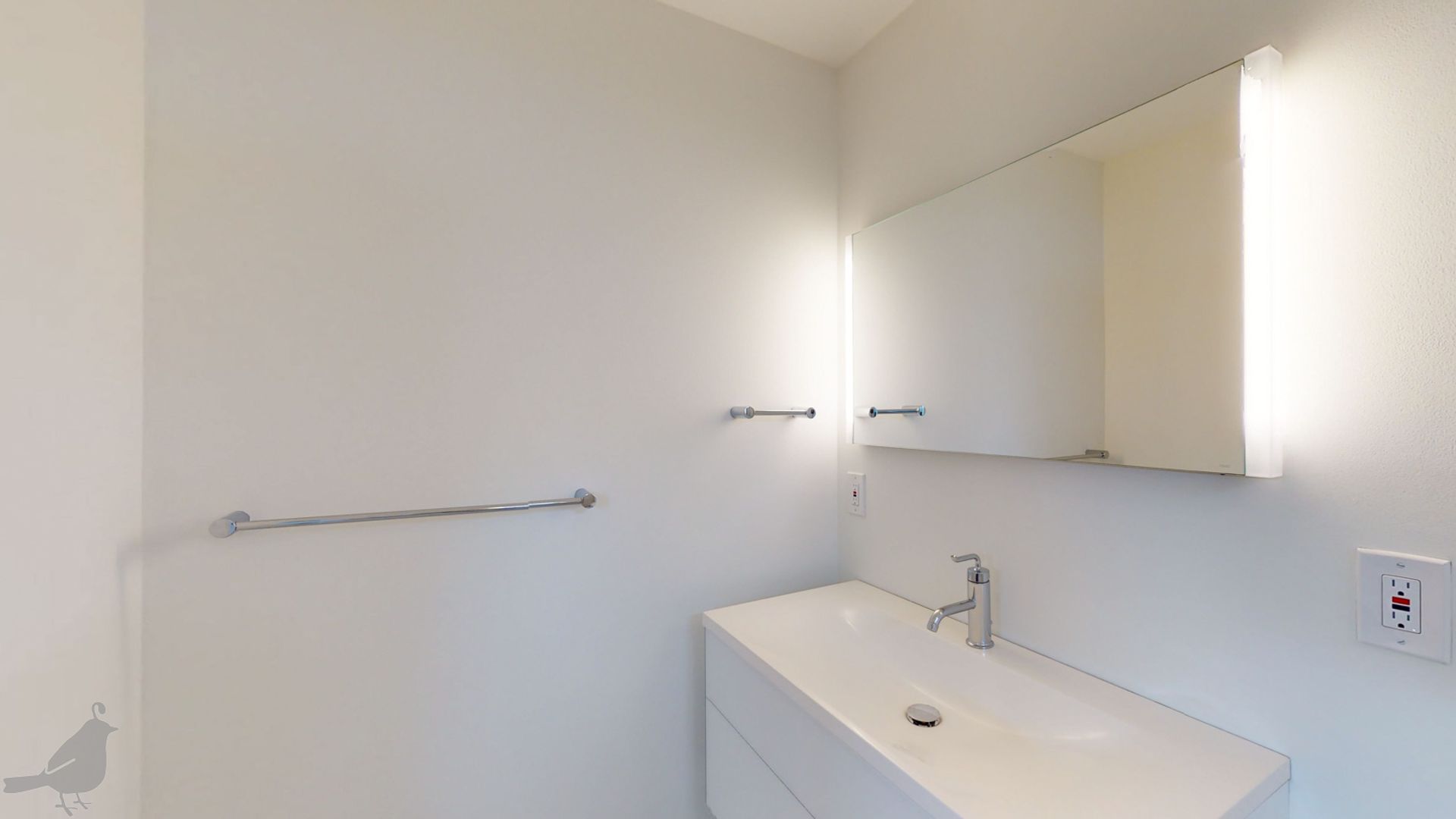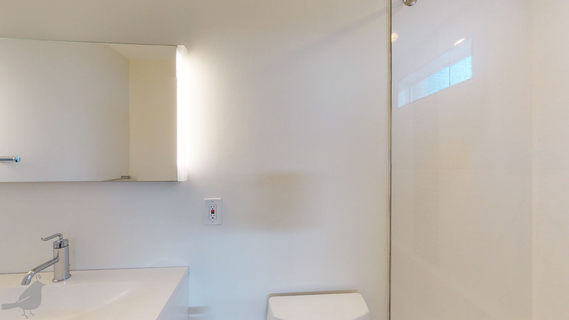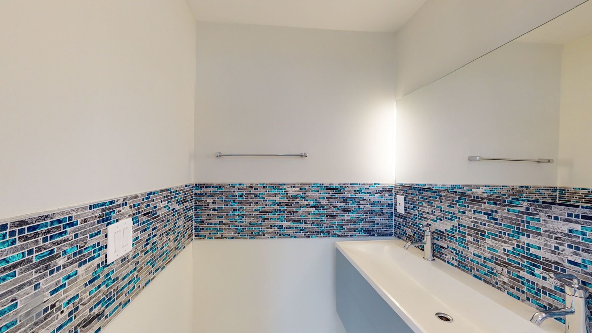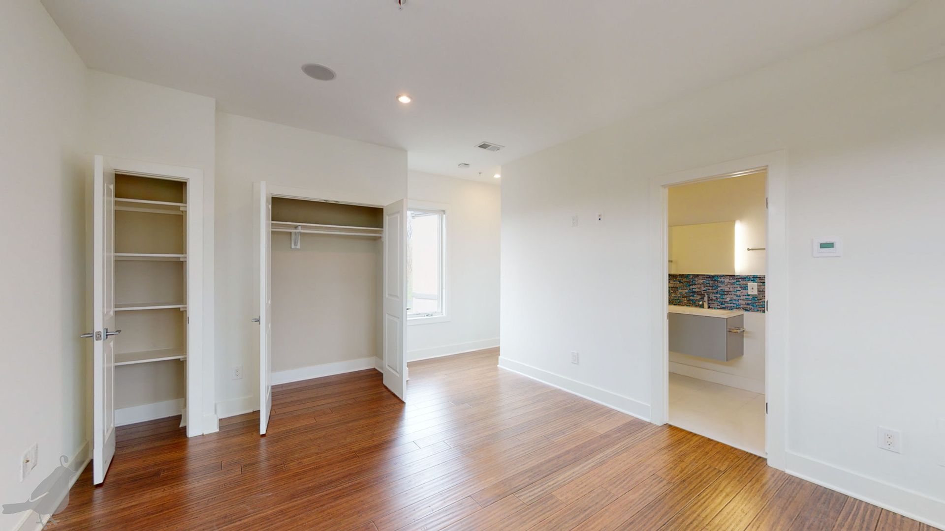 On the second level of the home, you'll find the home's second bedroom with frosted sliding glass doors, and a large window, which can easily be converted into your home office. Nearby is the guest bathroom with a large glass-enclosed walk-in shower. Down the hall is the third bedroom suite, spacious enough for a queen size bed, containing dual closets, and completed with an en-suite bathroom and double vanity. The home's in-unit washer and dryer are conveniently located on this level.
