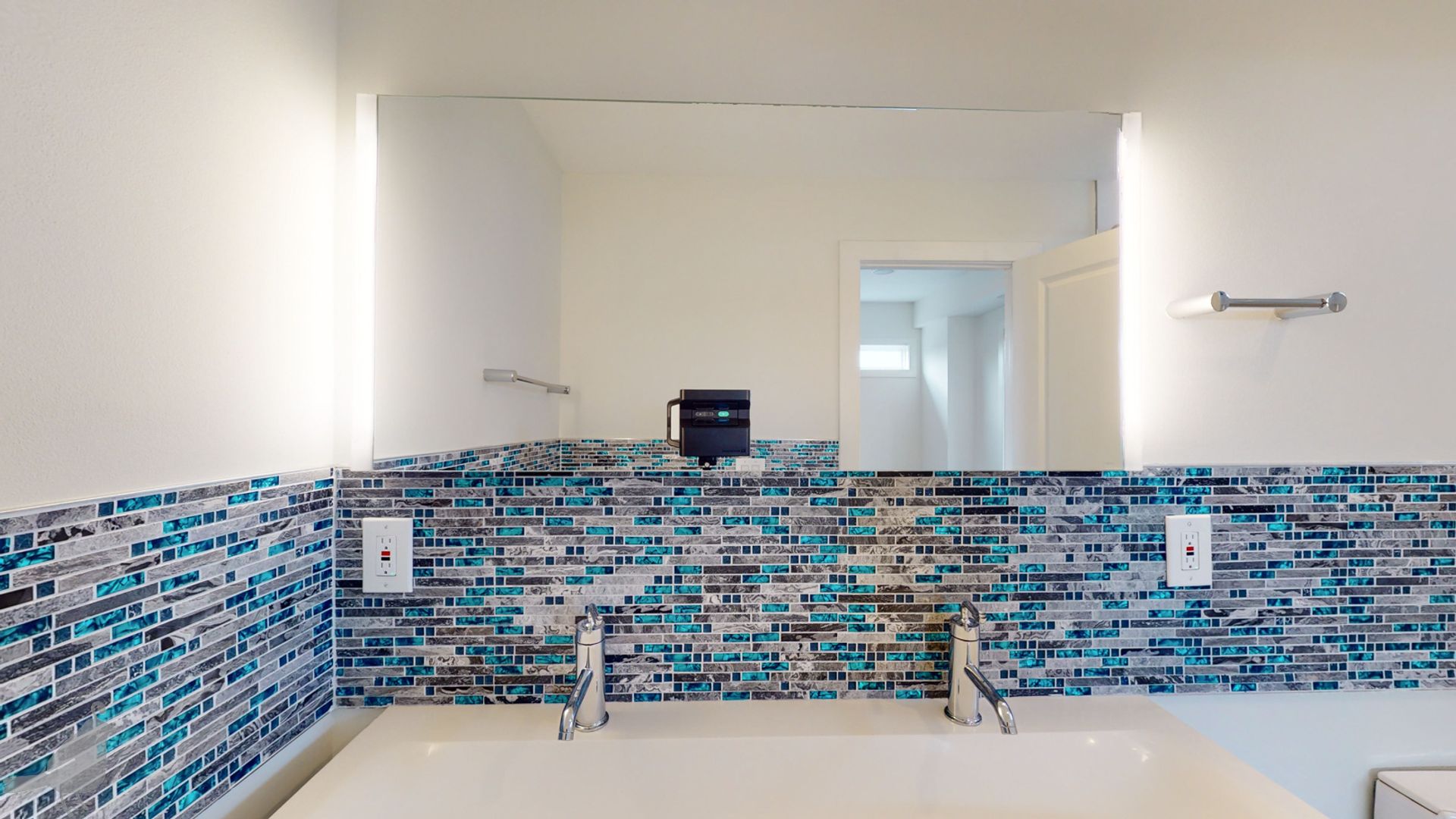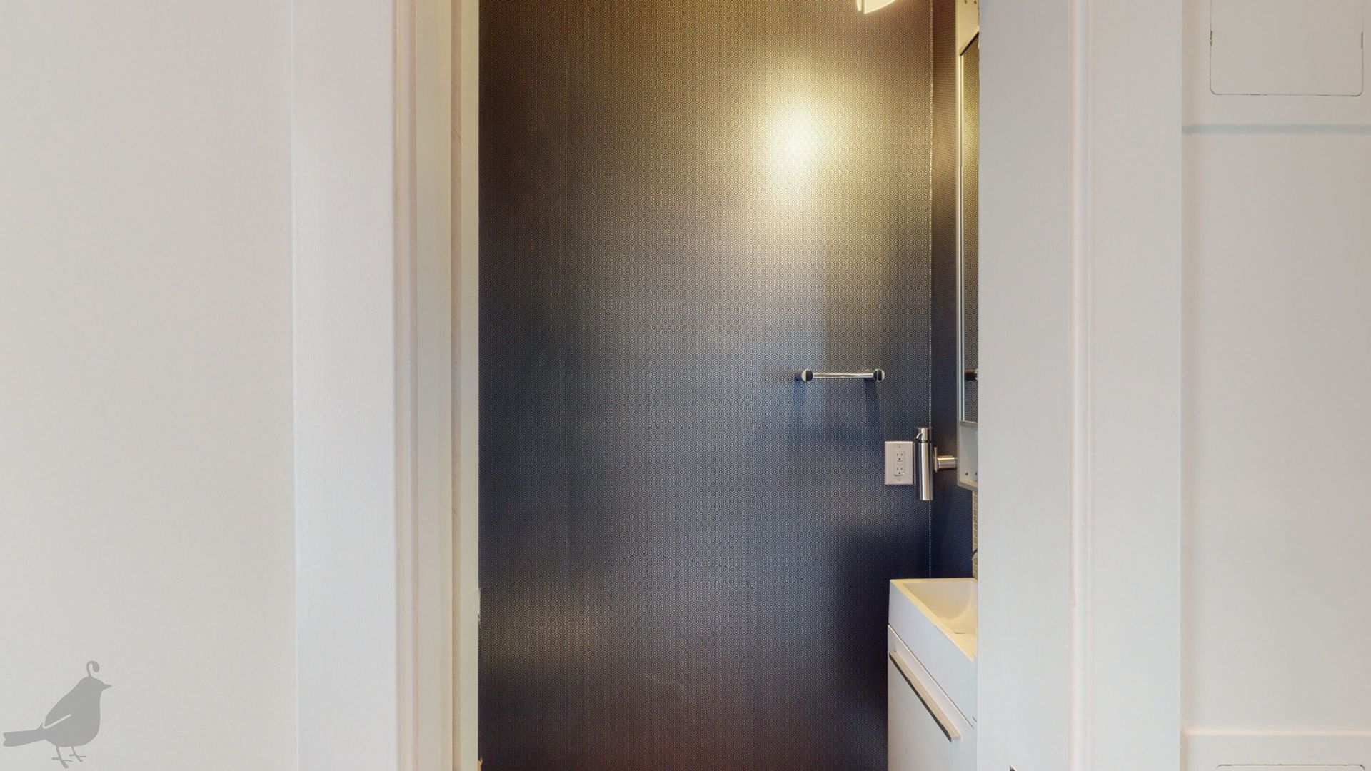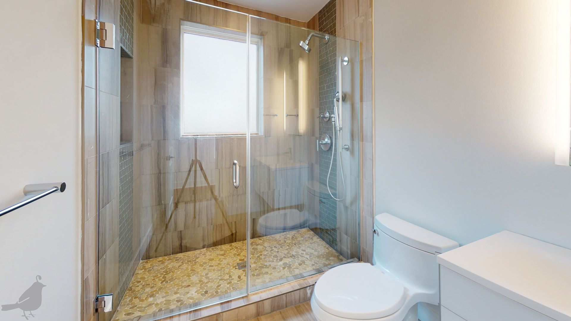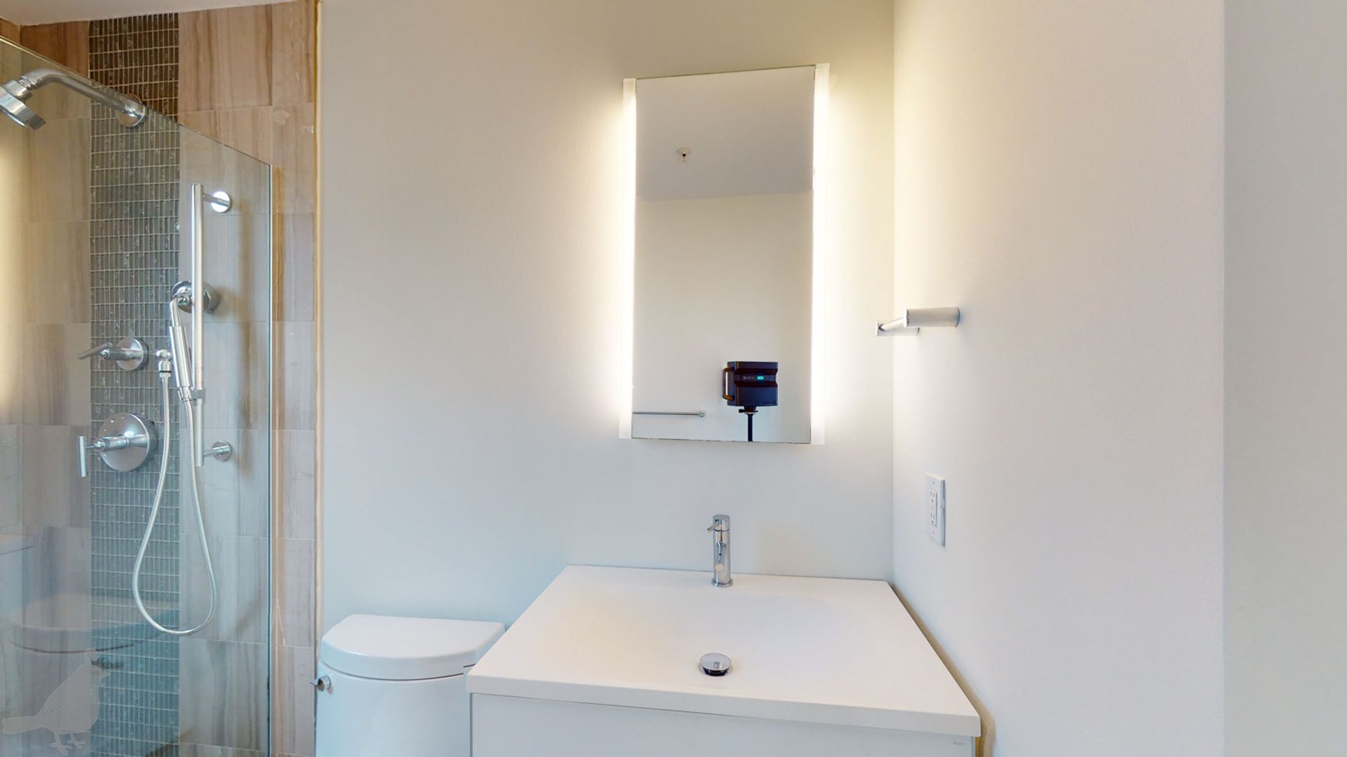 On the second level of the home, you'll find the home's second bedroom with frosted sliding glass doors, and a large window, which can easily be converted into your home office. Nearby is the guest bathroom with a large glass-enclosed walk-in shower. Down the hall is the third bedroom suite, spacious enough for a queen size bed, containing dual closets, and completed with an en-suite bathroom and double vanity. The home's in-unit washer and dryer are conveniently located on this level.