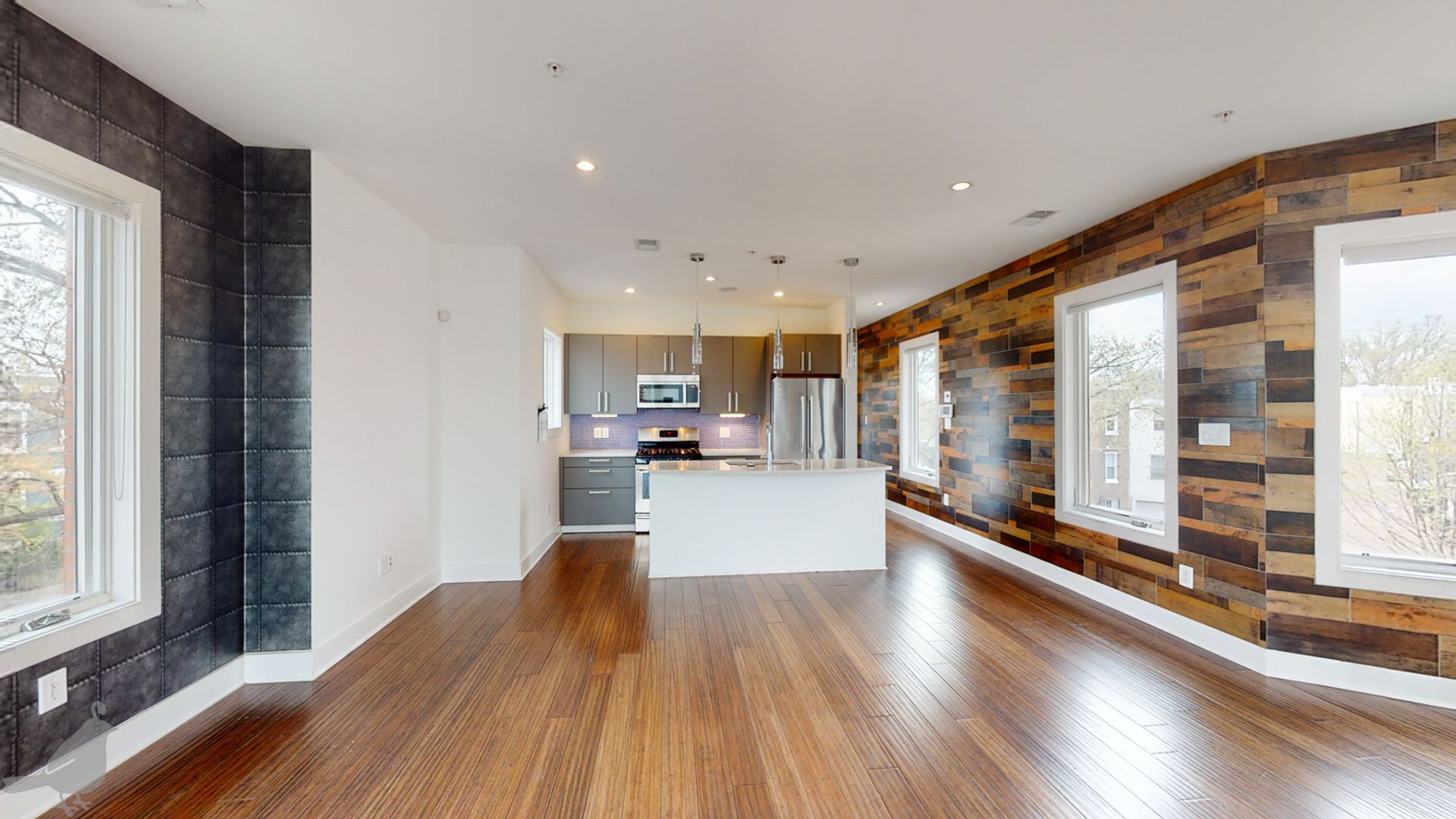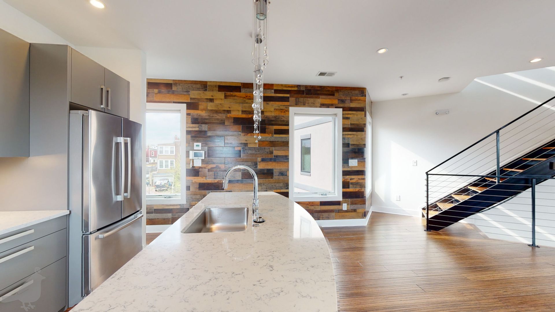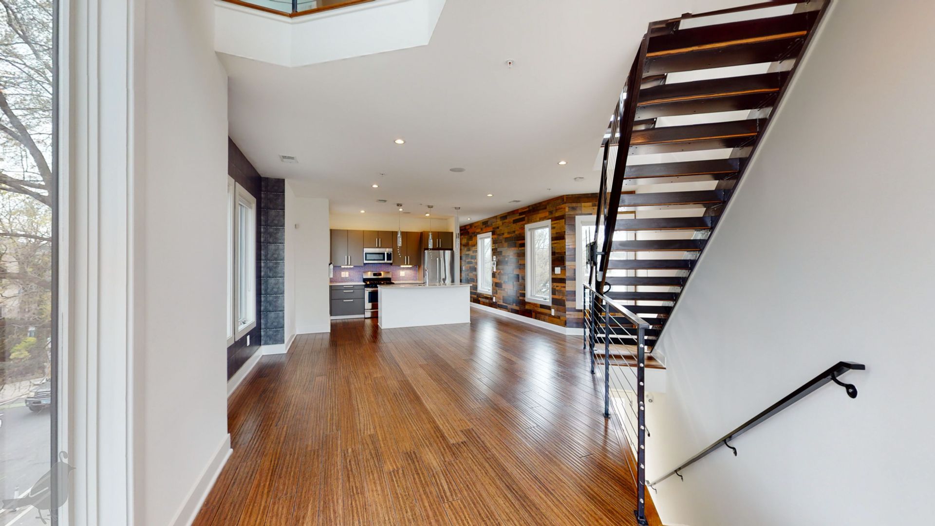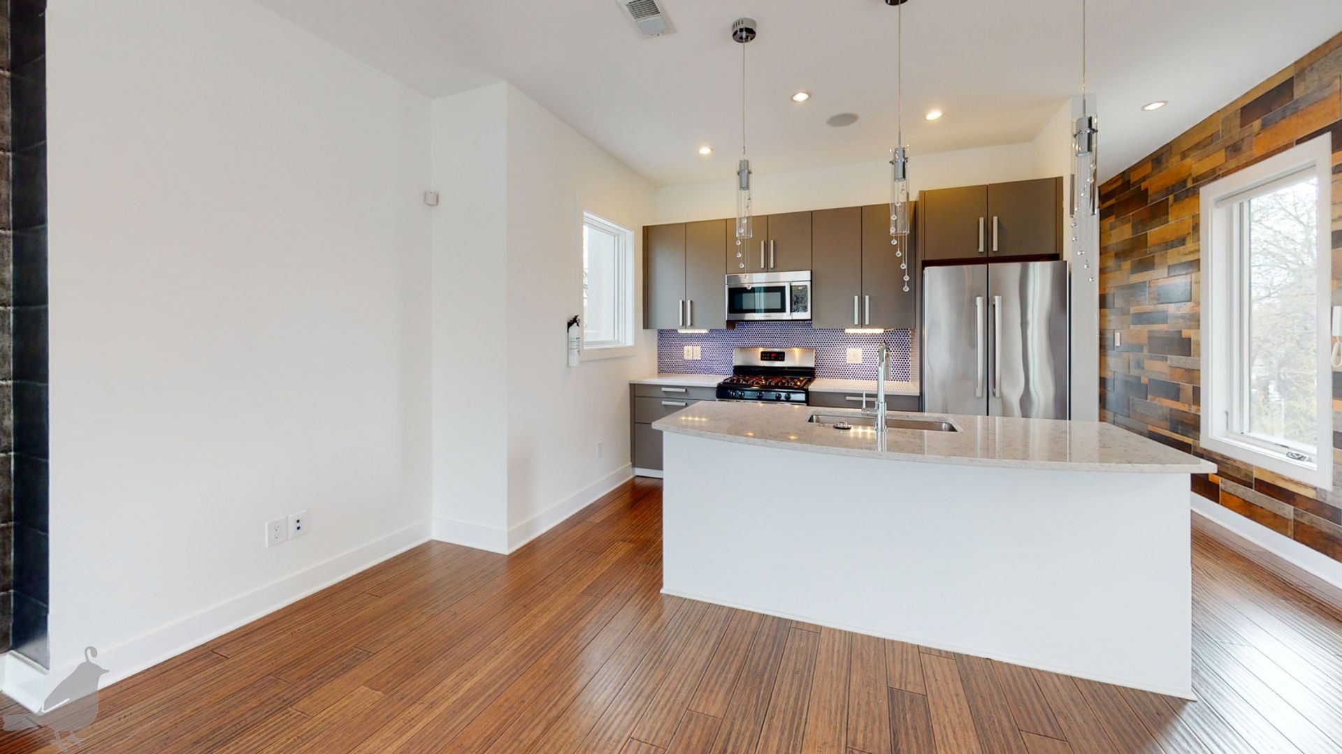 Ascend the stairs to this top floor three bedroom three and a half bathroom beauty and you'll instantly be in awe of the custom crystal chandelier greeting you from the two-story foyer and the contemporary and airy feel of open-concept living and dining areas of the main level. Dark hardwood flooring, oversized windows, custom wall finishes, and recess lighting are all featured in the gracious living room. Designed for effortless entertaining, the open kitchen exudes modern elegance with quartz countertops, custom tile backsplash, stainless still appliances, including a five-burner gas range, and a large island with an entertainer's bar. Past the kitchen are a convenient half bath and the primary bedroom suite. This bedroom that can easily accommodate a king-size bed and is outfitted with large windows providing a double exposure, two spacious closets, and an ensuite bathroom with a Nordic vanity, custom shower tiling, and a deep soaking tub.