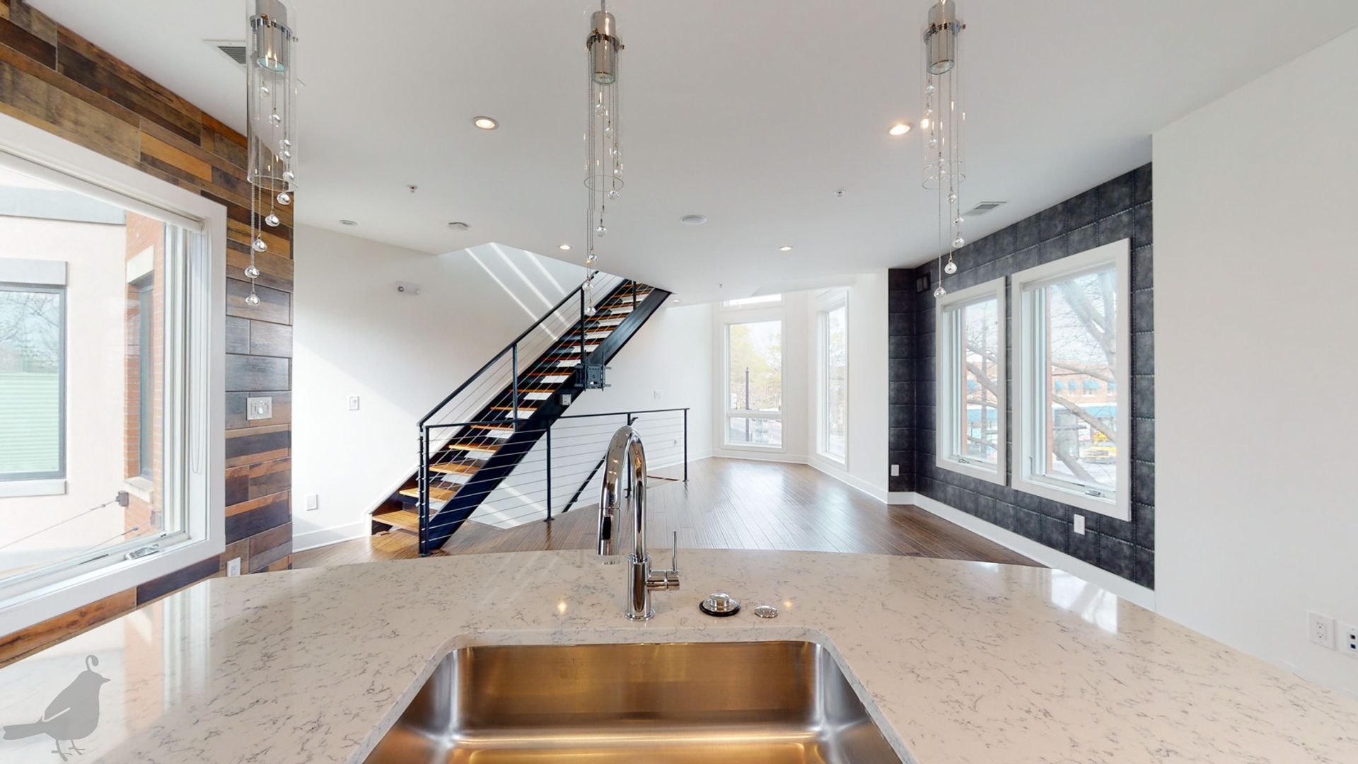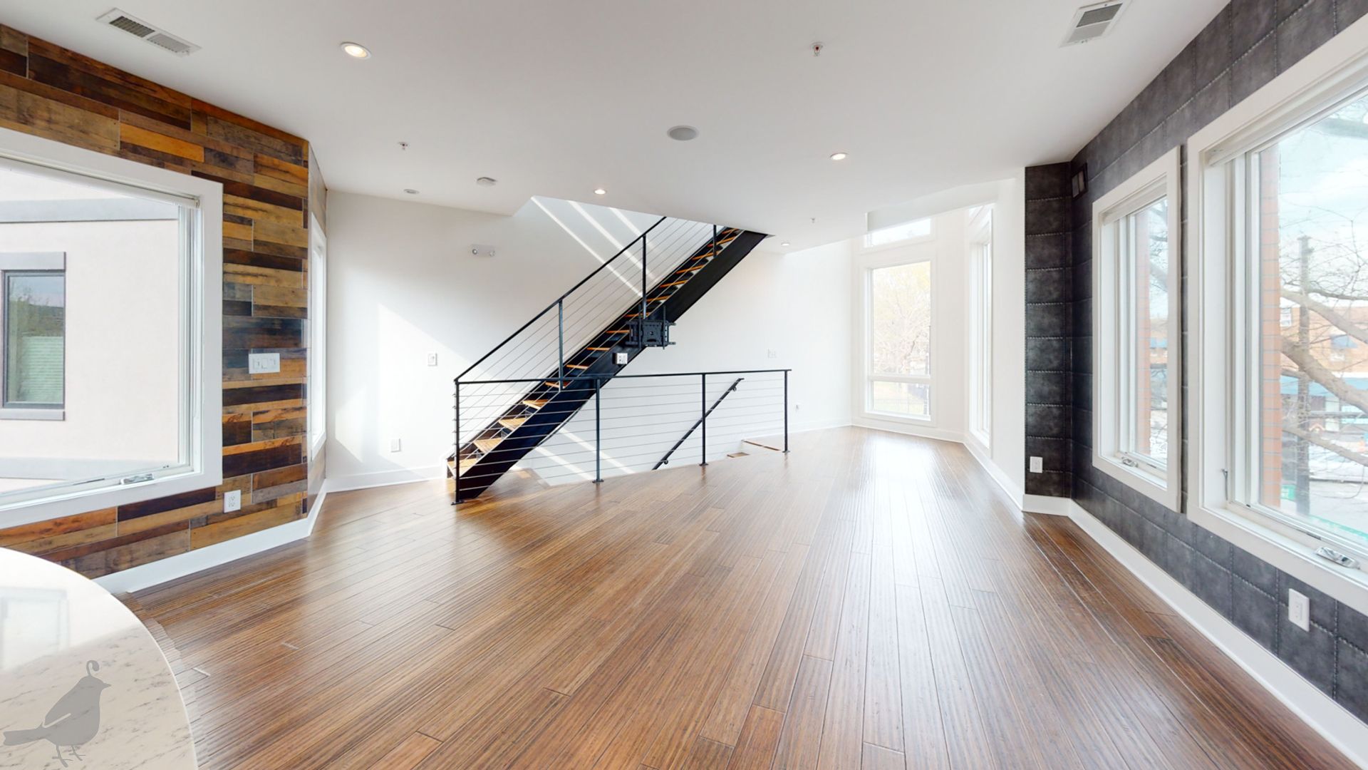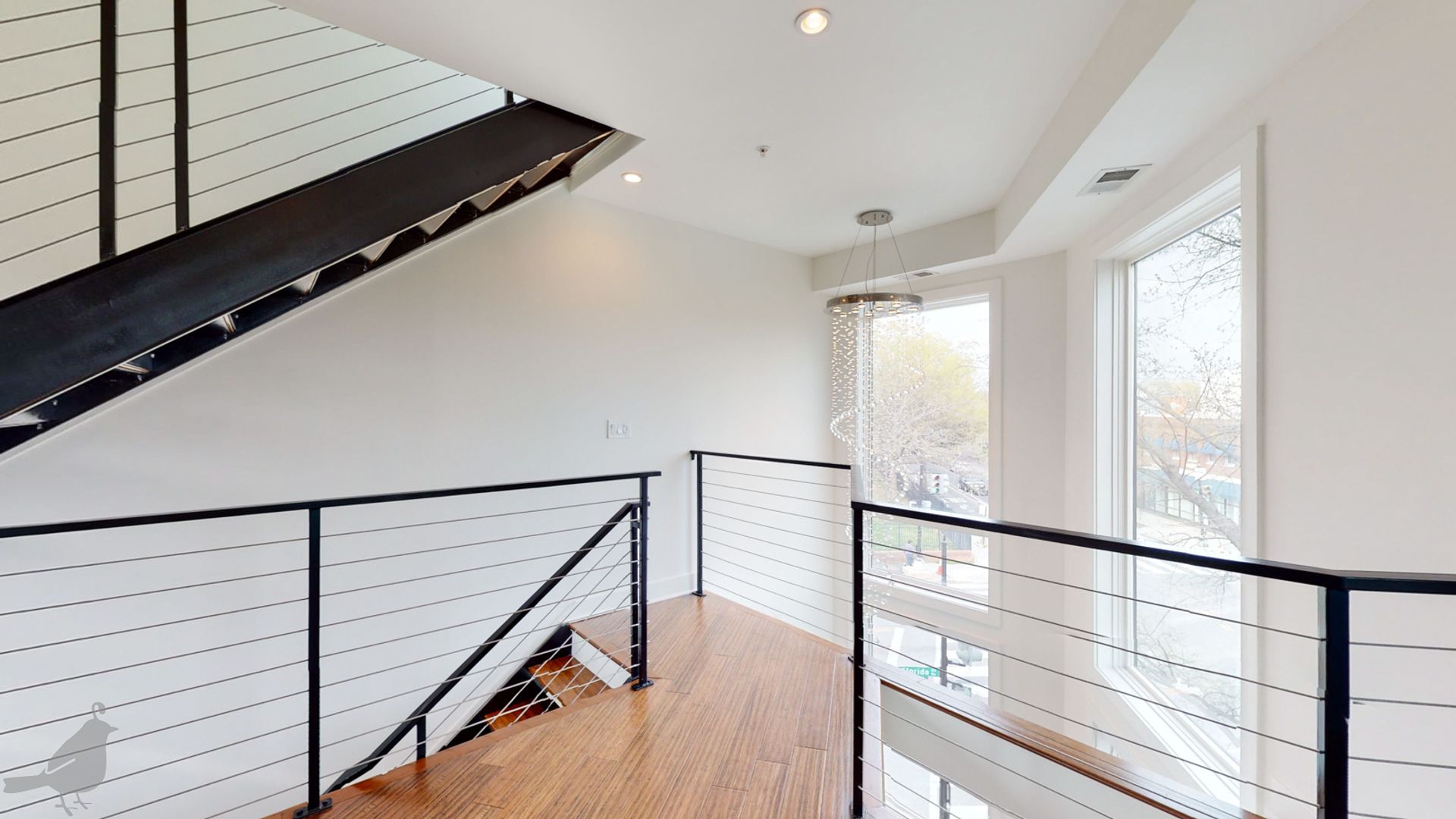 Ascend the stairs to this top floor three bedroom three and a half bathroom beauty and you'll instantly be in awe of the custom crystal chandelier greeting you from the two-story foyer and the contemporary and airy feel of open-concept living and dining areas of the main level. Dark hardwood flooring, oversized windows, custom wall finishes, and recess lighting are all featured in the gracious living room. Designed for effortless entertaining, the open kitchen exudes modern elegance with quartz countertops, custom tile backsplash, stainless still appliances, including a five-burner gas range, and a large island with an entertainer's bar. Past the kitchen are a convenient half bath and the primary bedroom suite. This bedroom that can easily accommodate a king-size bed and is outfitted with large windows providing a double exposure, two spacious closets, and an ensuite bathroom with a Nordic vanity, custom shower tiling, and a deep soaking tub.