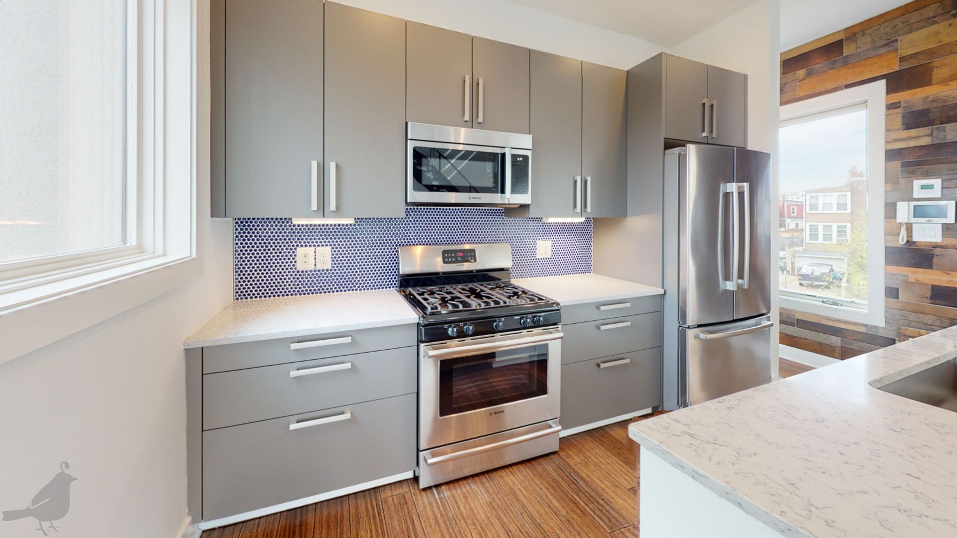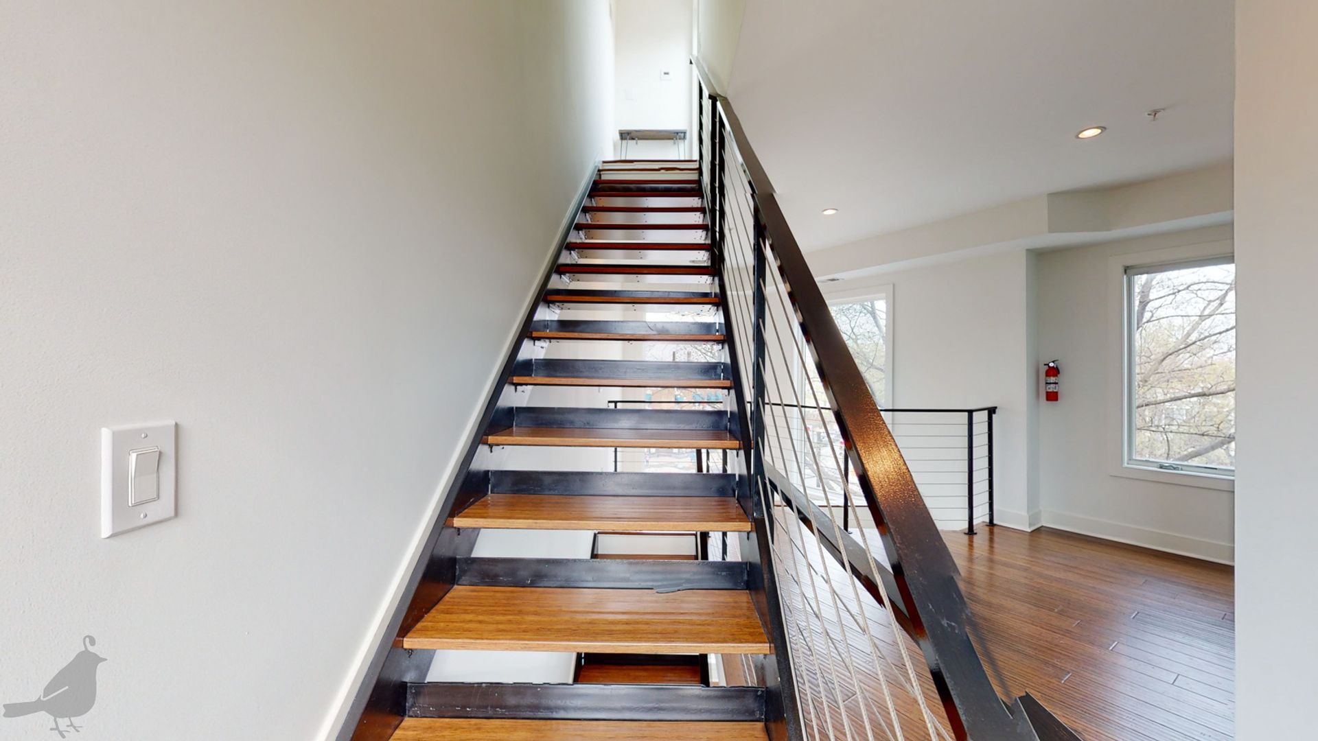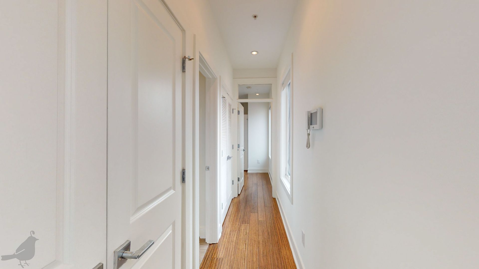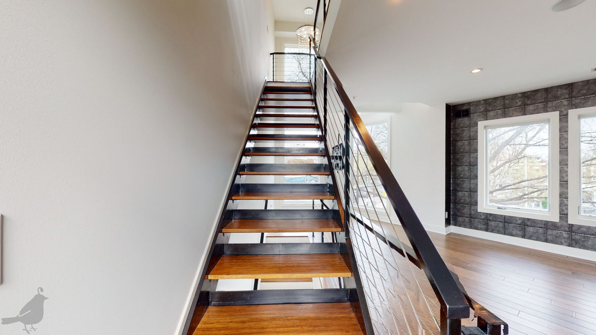 Ascend the stairs to this top floor three bedroom three and a half bathroom beauty and you'll instantly be in awe of the custom crystal chandelier greeting you from the two-story foyer and the contemporary and airy feel of open-concept living and dining areas of the main level. Dark hardwood flooring, oversized windows, custom wall finishes, and recess lighting are all featured in the gracious living room. Designed for effortless entertaining, the open kitchen exudes modern elegance with quartz countertops, custom tile backsplash, stainless still appliances, including a five-burner gas range, and a large island with an entertainer's bar. Past the kitchen are a convenient half bath and the primary bedroom suite. This bedroom that can easily accommodate a king-size bed and is outfitted with large windows providing a double exposure, two spacious closets, and an ensuite bathroom with a Nordic vanity, custom shower tiling, and a deep soaking tub.