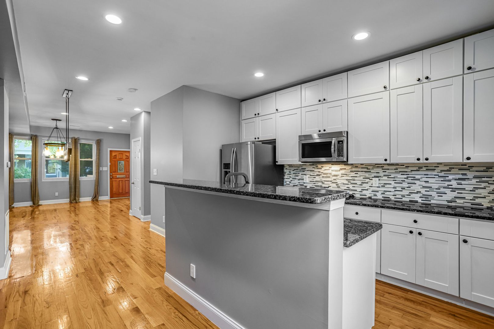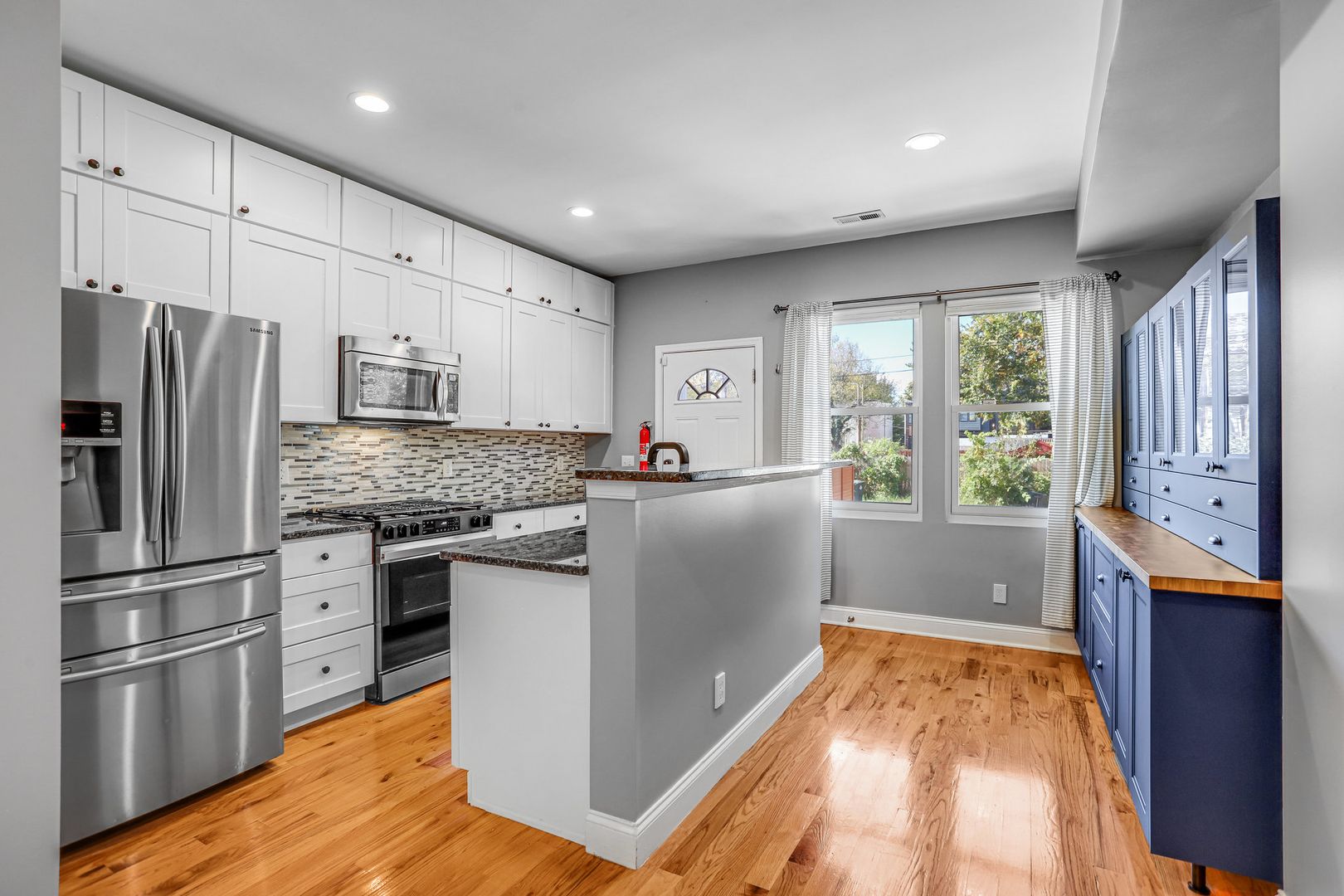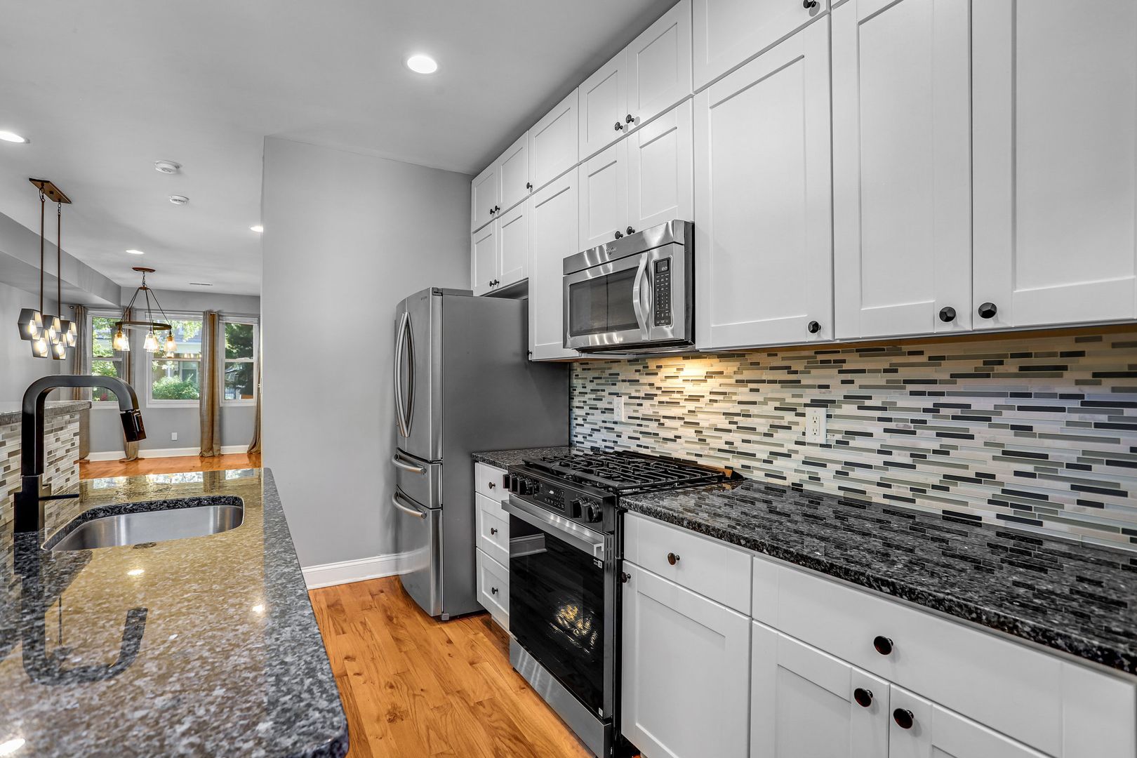 • Spacious kitchen with granite counters, island, and stainless steel appliances