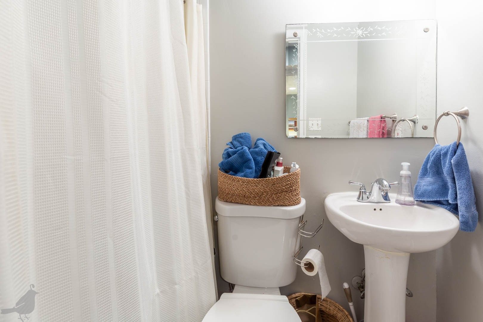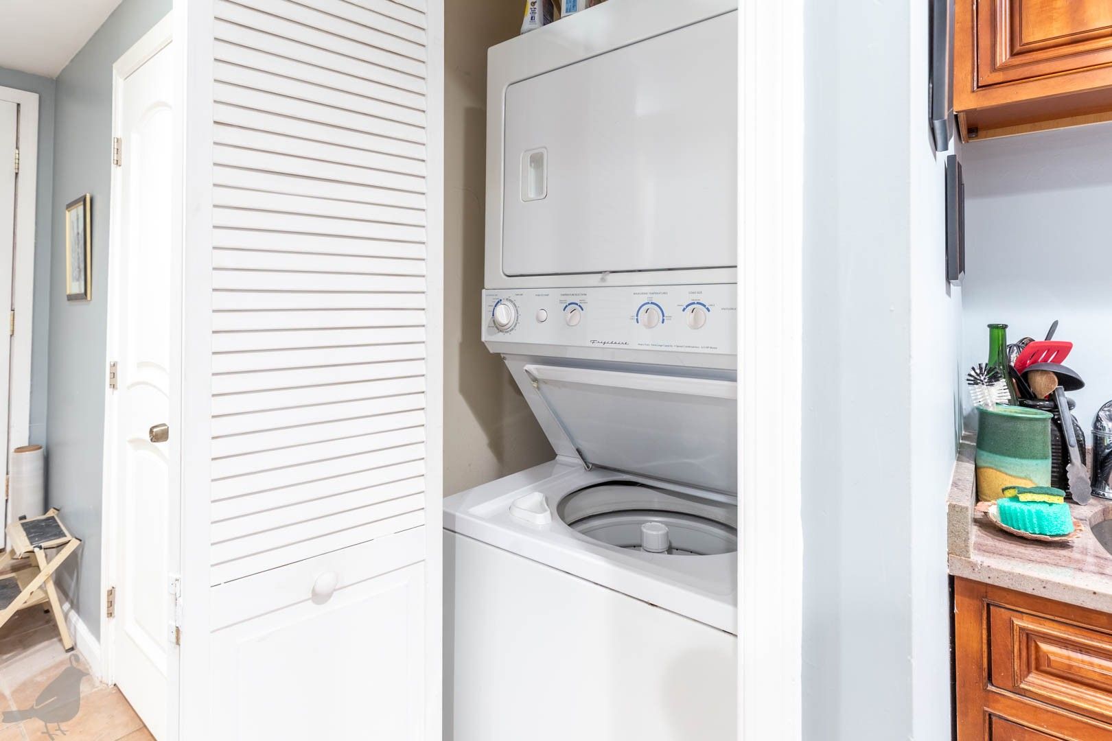 One nice-sized bedroom is located in the front of the unit, and head down the hall to find the second spacious bedroom. Both bedrooms have a great amount of natural light thanks to the lovely windows. The full bathroom has a tiled walk-in shower, and the home is completed with a stacked front-loading washer and dryer.