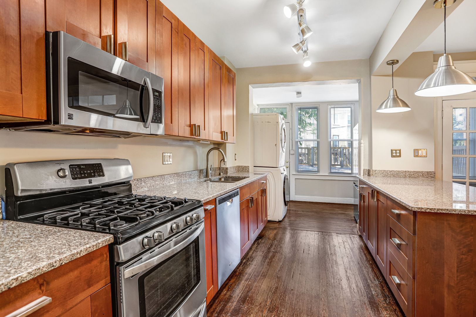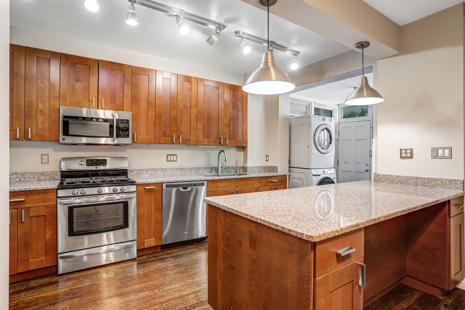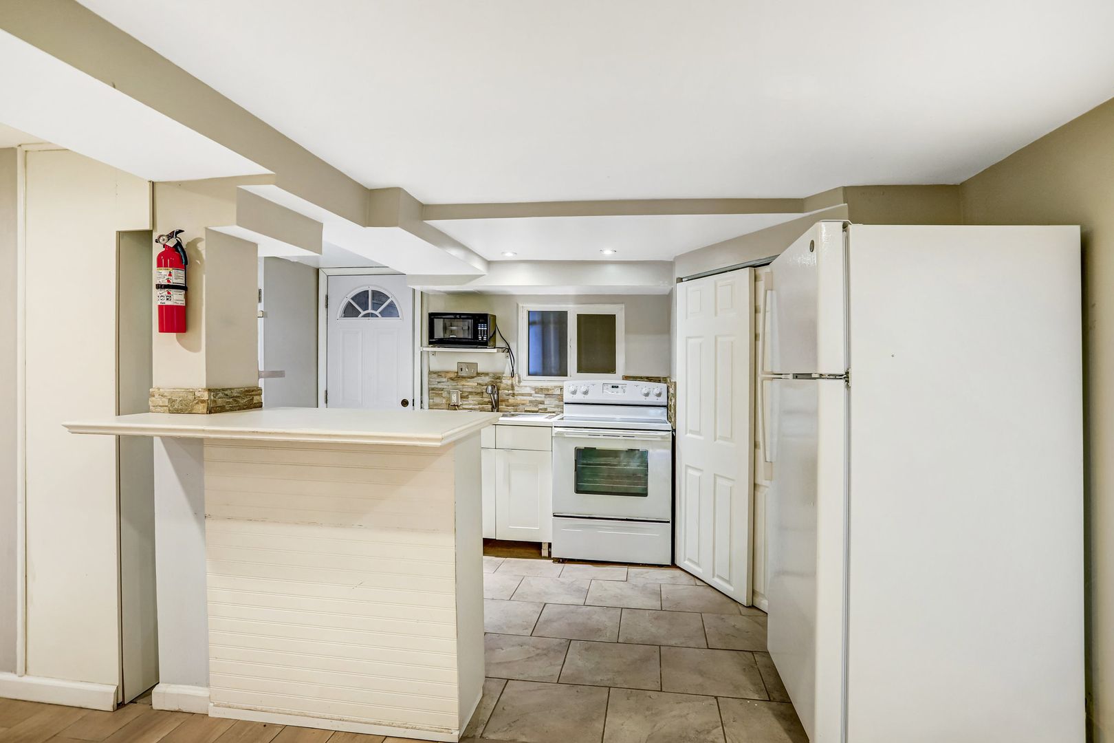 The home features a functional layout with in-unit washer and dryer, a well-equipped kitchen with gas stove, oven, microwave, dishwasher, and refrigerator, and additional flexibility with a finished basement, which includes its own refrigerator and stove/oven.