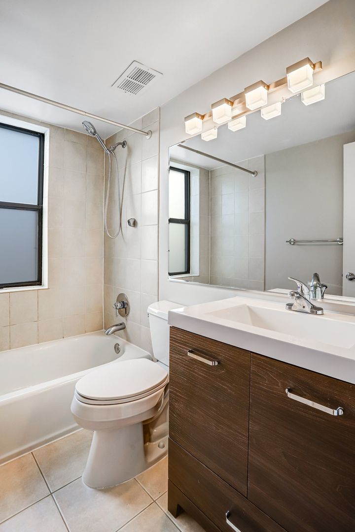 The bedroom is spacious with lots of natural light and features plenty of closet space. The main bathroom features a modern vanity with spacious counter space and a shower tub. The unit includes a full-size stackable washer and dryer and tons of extra storage. The building is equipped with an elevator!