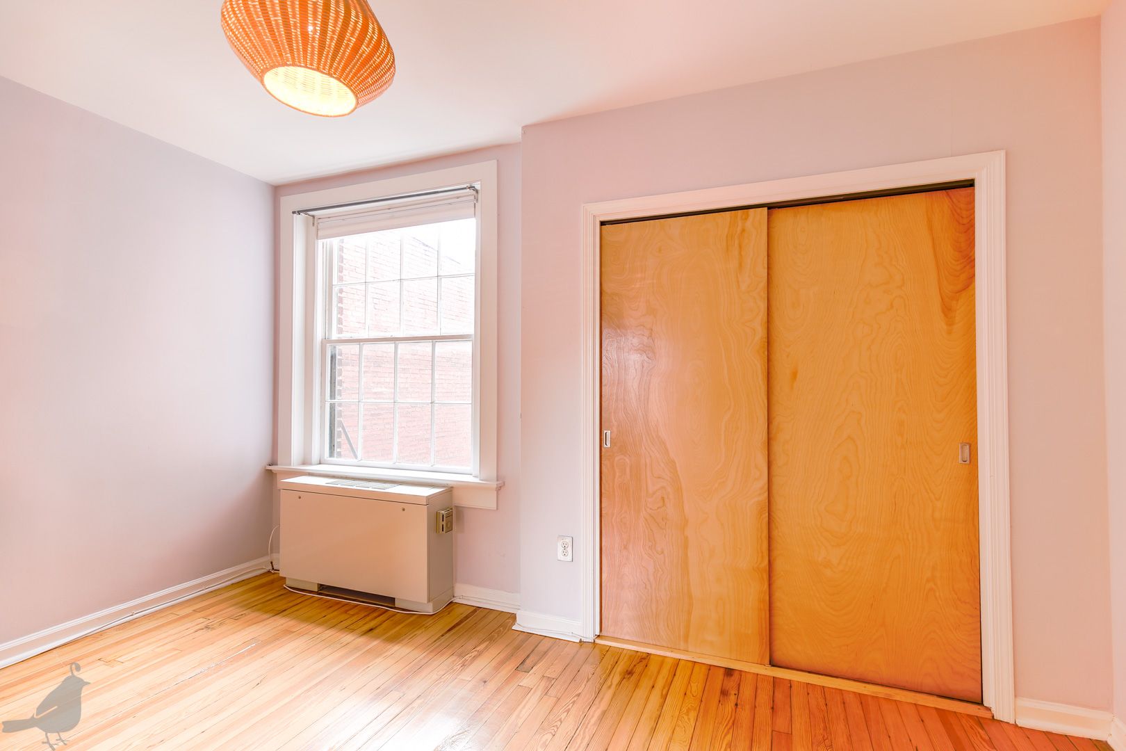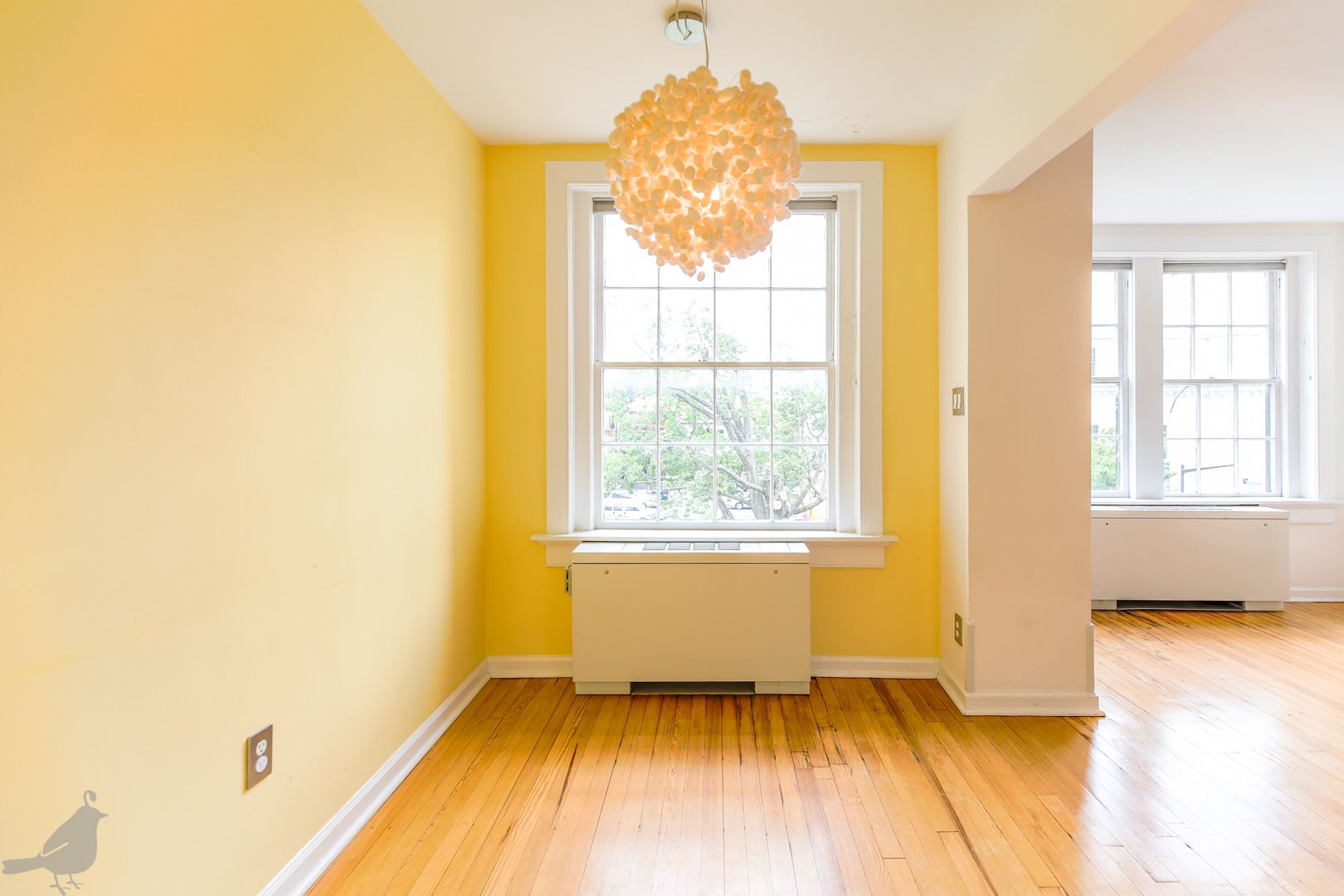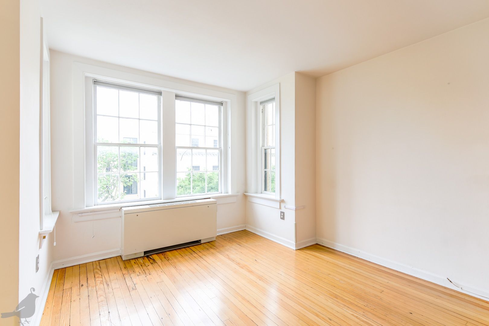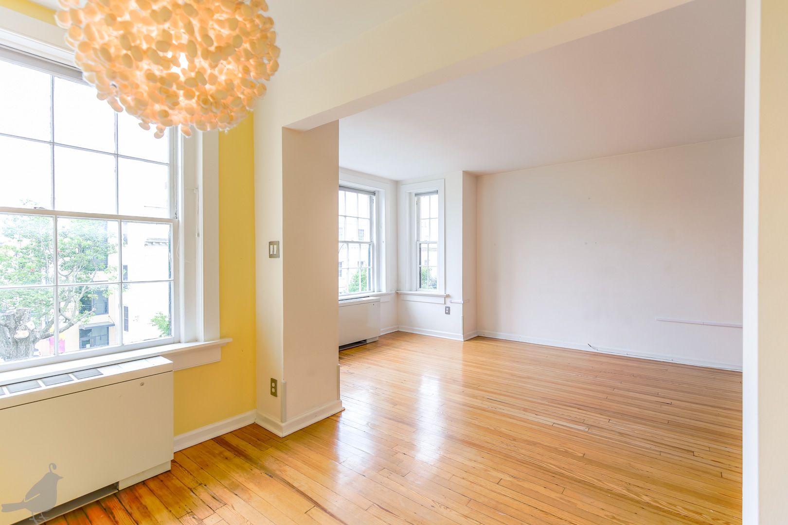 Ideally situated between Dupont Circle and U Street on the 3rd floor of a historic building, this sun-drenched two-bedroom condo cannot be beaten. The open living room and sunny dining room with custom light fixture are perfect for entertaining guests with great southern views. Hardwood floors, built-in shelves, and plentiful closet space abound. The kitchen has a built-in desk, concrete countertops, and stainless steel appliances. Down the long hallway, you'll find the two spacious bedrooms and classic hall bathroom with a fun pop of color. Rounding out this nest is the washer/dryer which is cleverly hidden behind a barn door in the first bedroom!