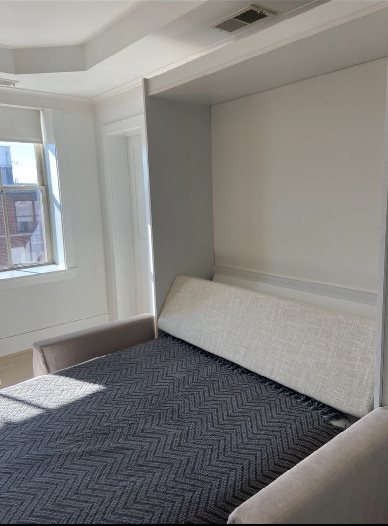 This comfortable, modern furnished apartment home is the perfect place for you! It features a custom-built Murphy/wall bed with couch and under-bed storage, a walk-in closet, and a large, state-of-the-art kitchen with stainless steel appliances, including a full-size stove with glass-top cooking range, built-in microwave, oversized refrigerator, generous counter space, and dishwasher. The unit also includes a modern washer/dryer, built-in bookcases tucked behind beautiful cabinetry, hardwood floors, modern fixtures, a wall mount for a TV, and three additional closets.