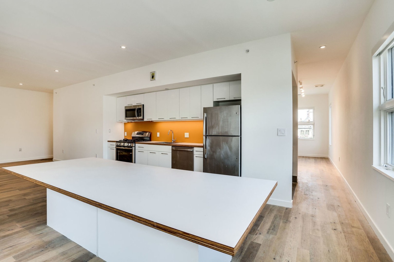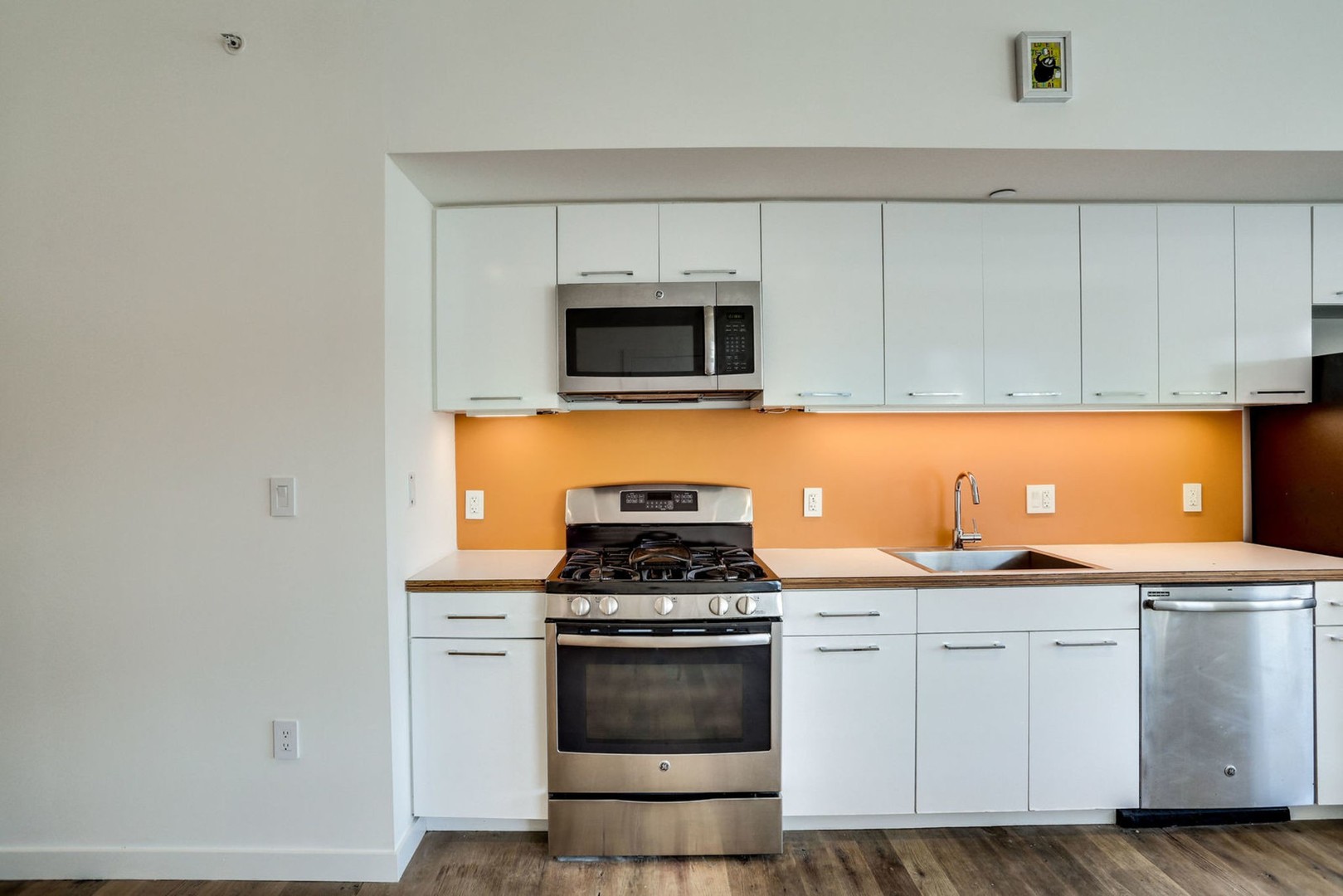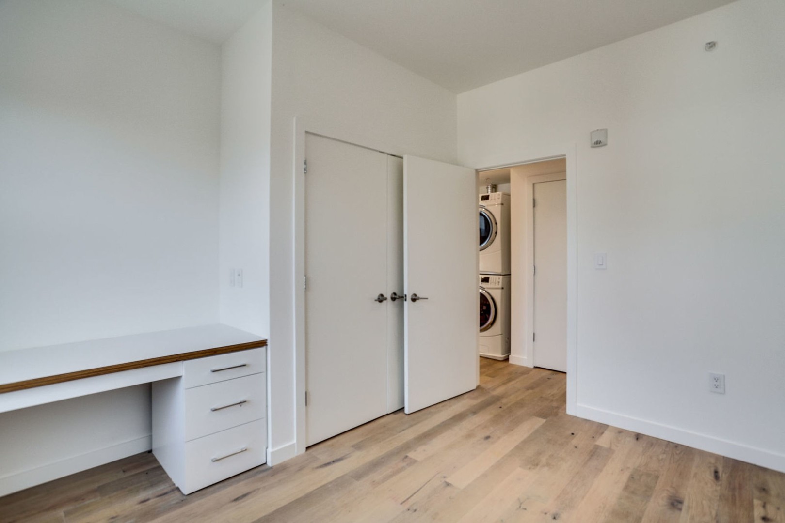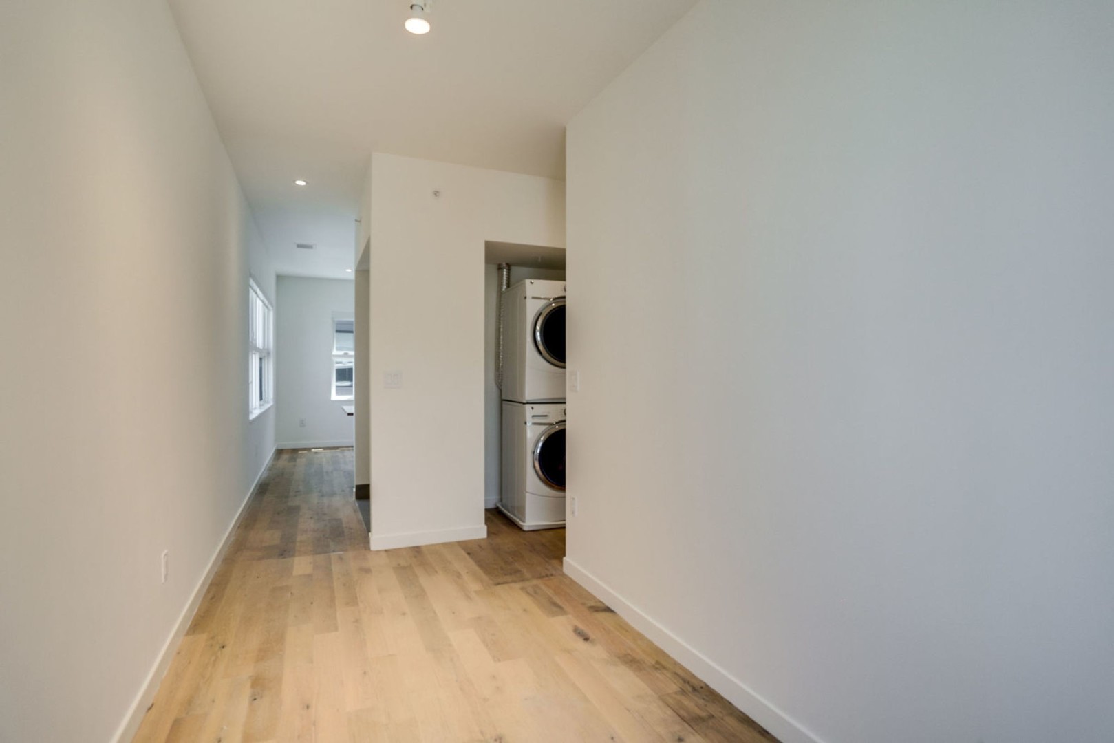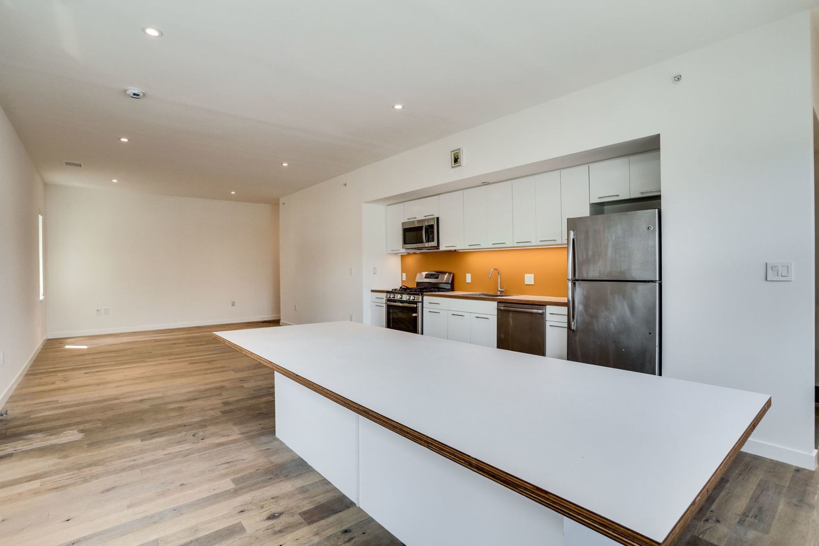 This modern, two-bedroom, one bath apartment is the perfect spot! Nestled in a boutique building that features a gallery space on the first floor and a shared rooftop, this is a truly unique space. Walking into the unit, you'll find an open living area and kitchen. Large windows saturate the space with natural light that is carried through the home, courtesy of the gorgeous hardwood flooring. The kitchen offers stainless steel appliances, including a gas stove. Down the hallway, you'll find a work sink, washer and dryer, and a full bath, which has an exterior sink to make it even more convenient when company is over. Both of the bedrooms are generously sized and feature desk nooks that emphasize the live/work atmosphere of the apartment.
