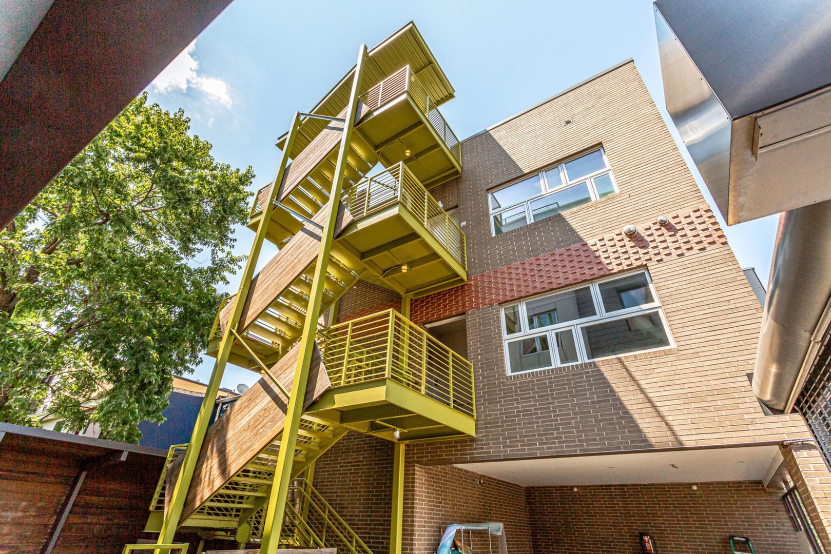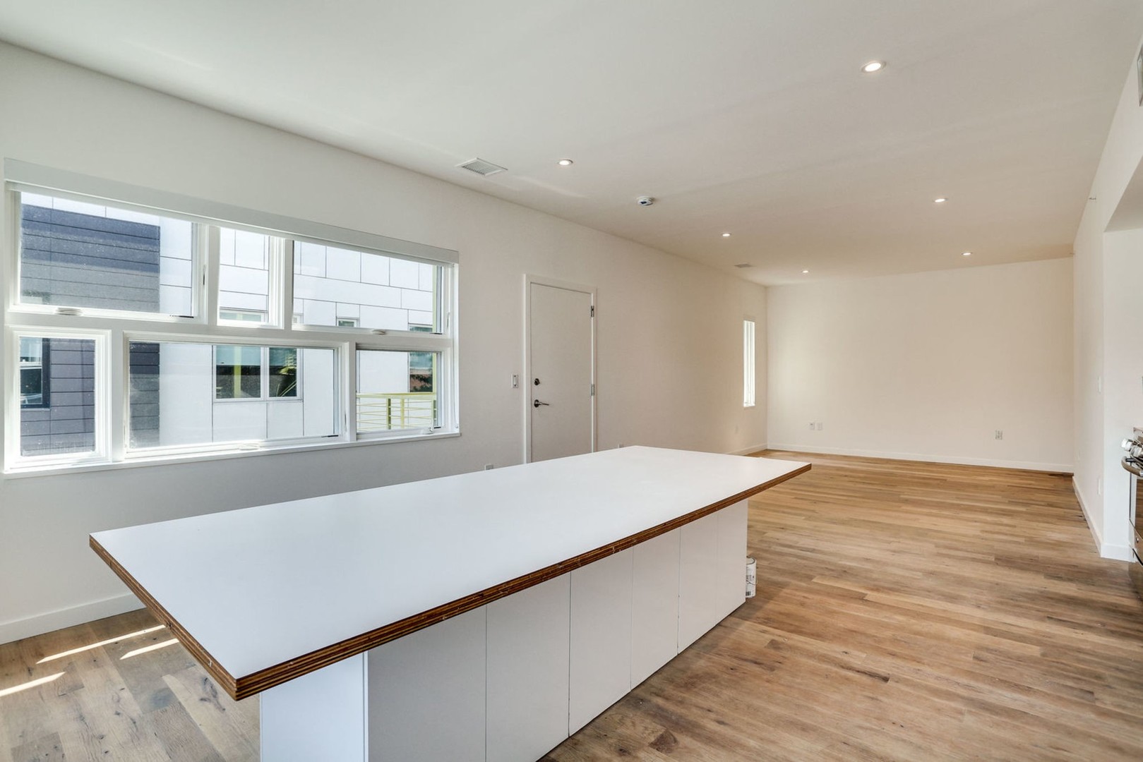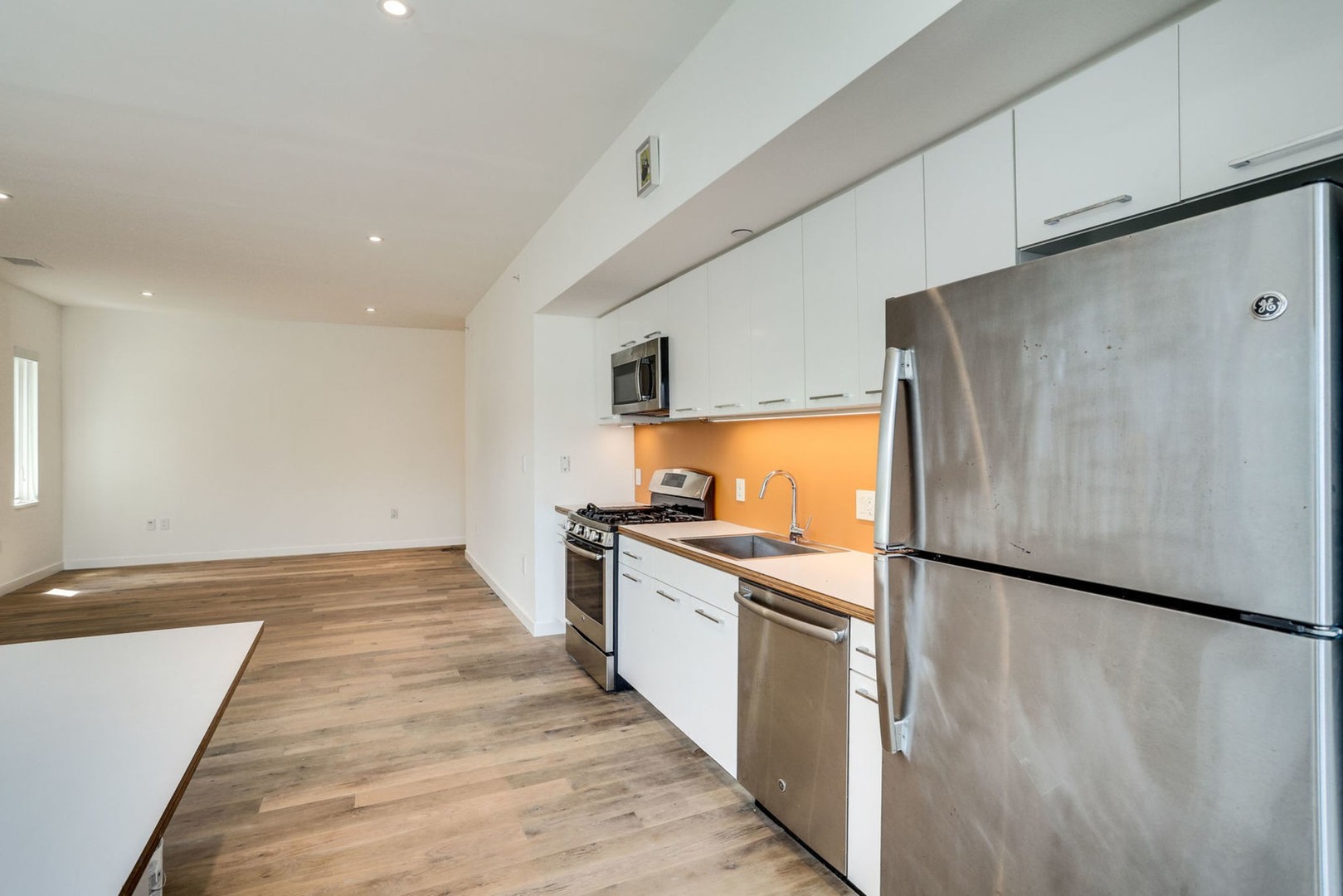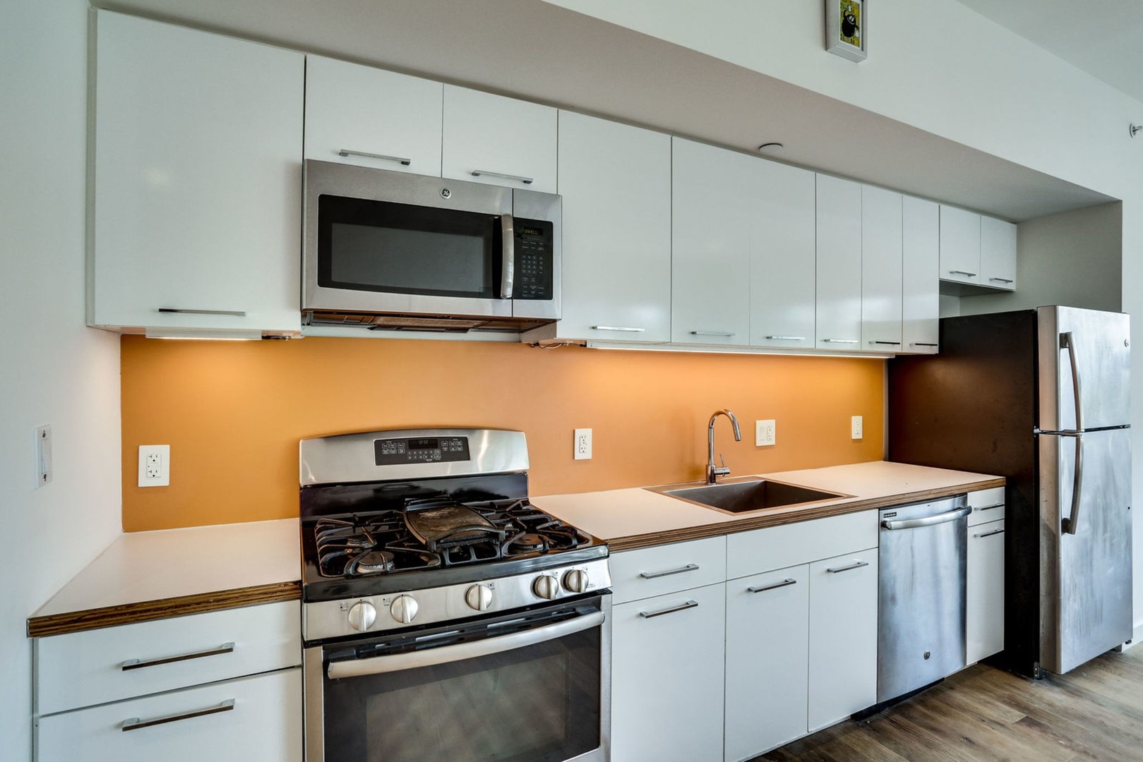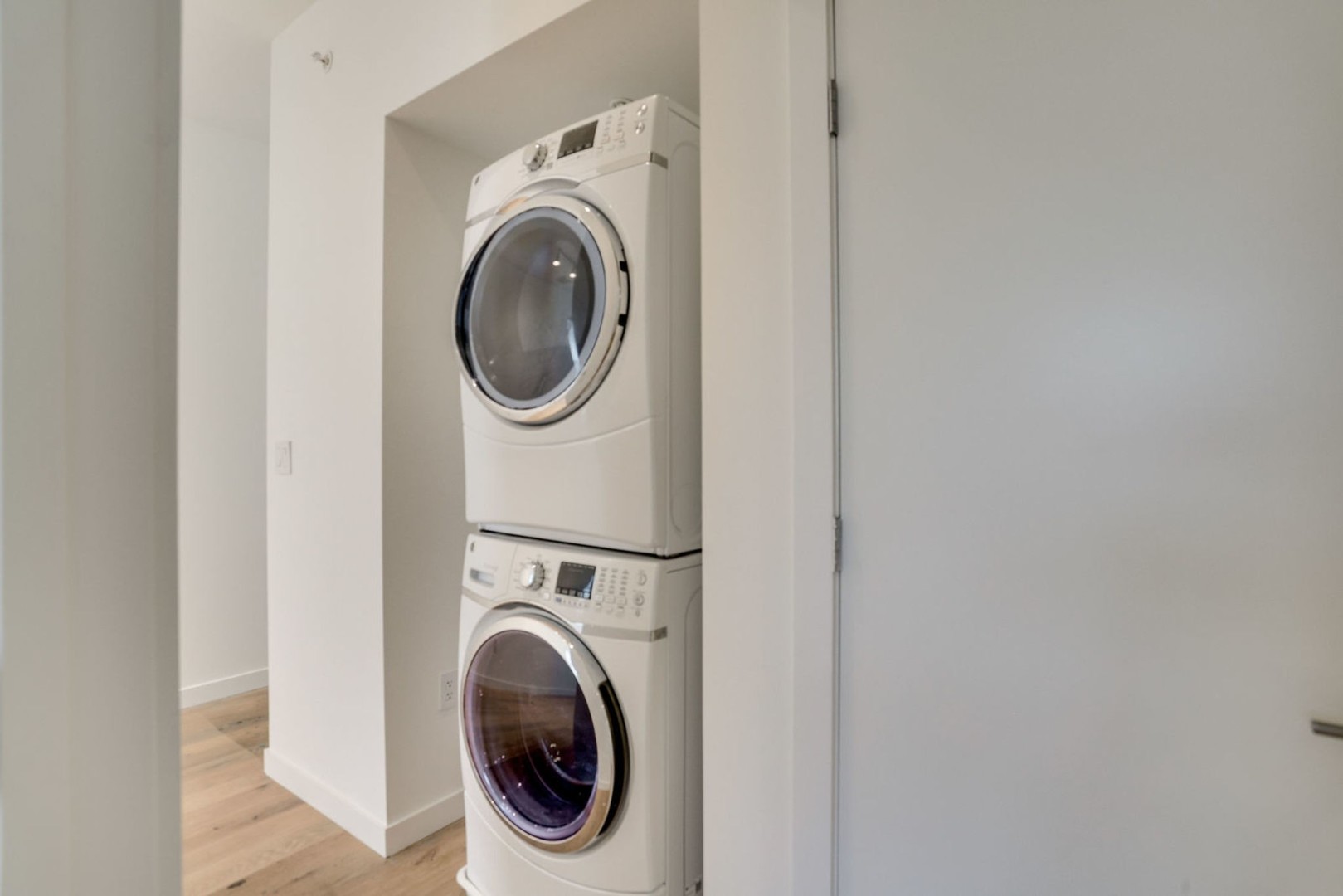 This modern, two-bedroom, one bath apartment is the perfect spot! Nestled in a boutique building that features a gallery space on the first floor and a shared rooftop, this is a truly unique space. Walking into the unit, you'll find an open living area and kitchen. Large windows saturate the space with natural light that is carried through the home, courtesy of the gorgeous hardwood flooring. The kitchen offers stainless steel appliances, including a gas stove. Down the hallway, you'll find a work sink, washer and dryer, and a full bath, which has an exterior sink to make it even more convenient when company is over. Both of the bedrooms are generously sized and feature desk nooks that emphasize the live/work atmosphere of the apartment.