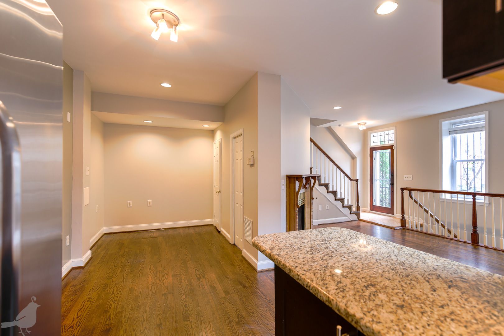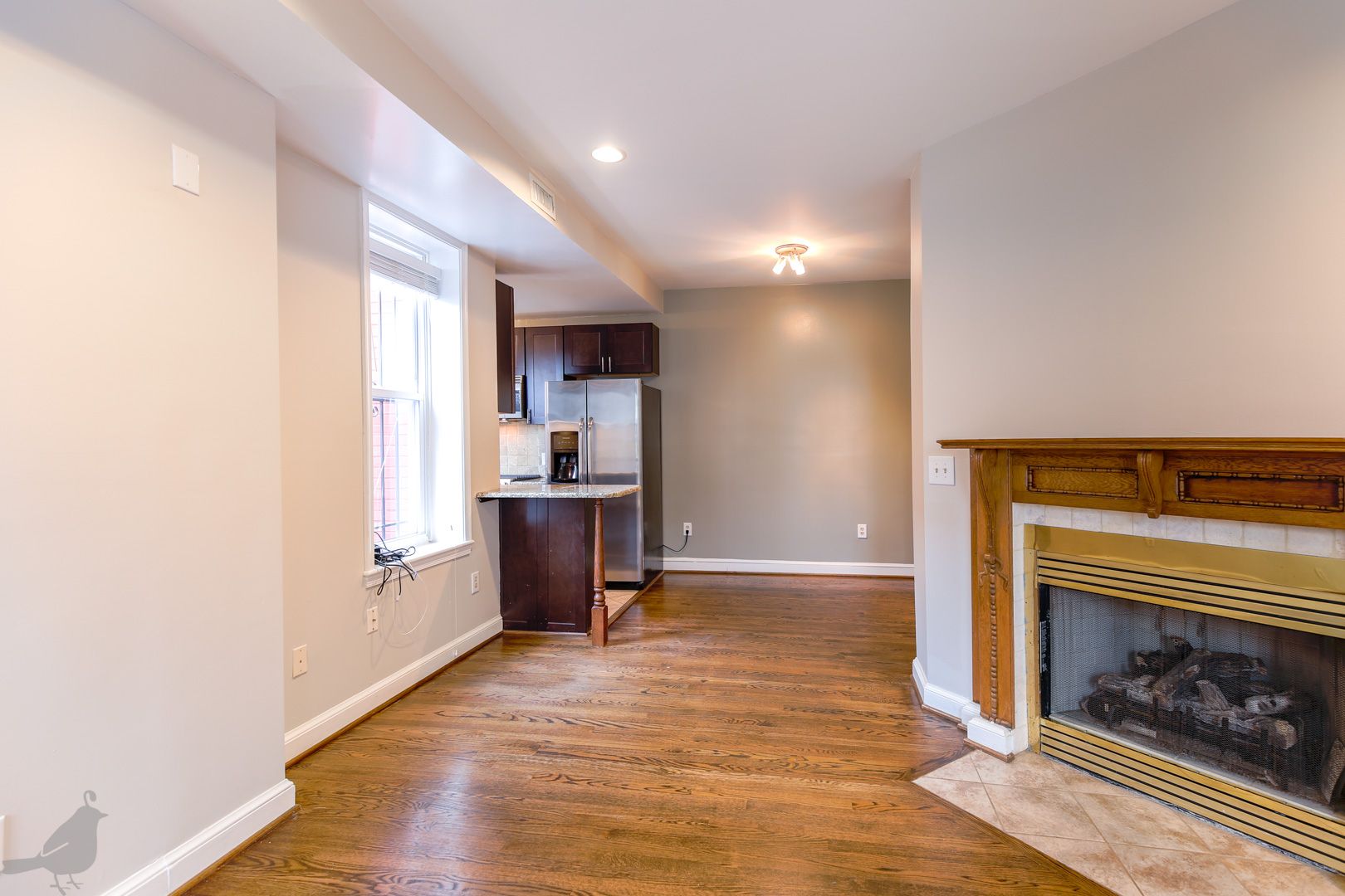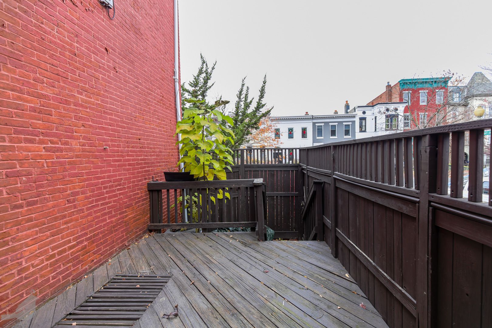 This inviting rowhouse sits on the corner a charming historic block. Beautiful hardwood floors fill the living and dining area on the first floor, and glisten with the flooding natural light. A fireplace graces this great open space, adding to the cozy and welcoming atmosphere. The updated kitchen features stainless steel appliances, granite countertops, and plenty of cabinet space. It opens up to a secluded deck that also provides access to the front yard. A half-bath completes this floor.