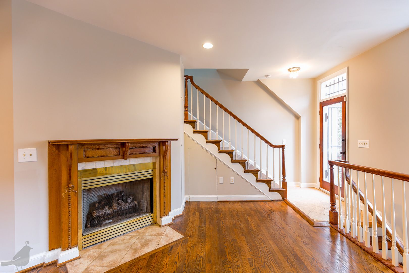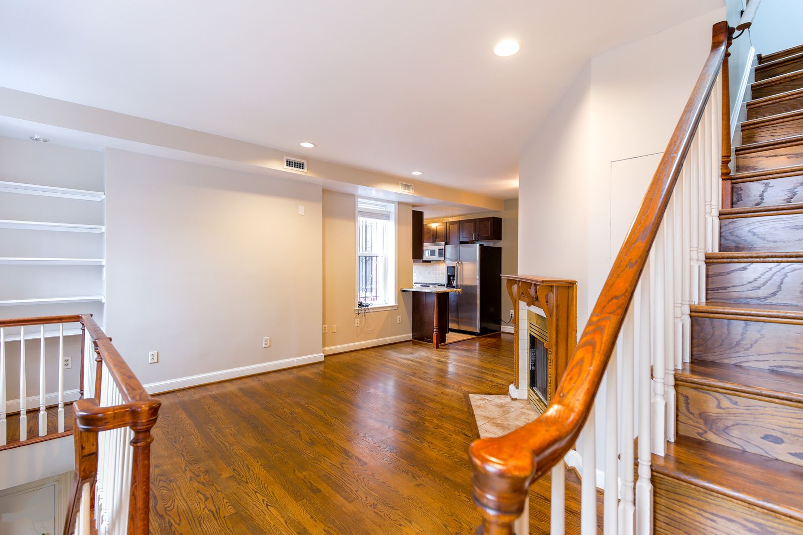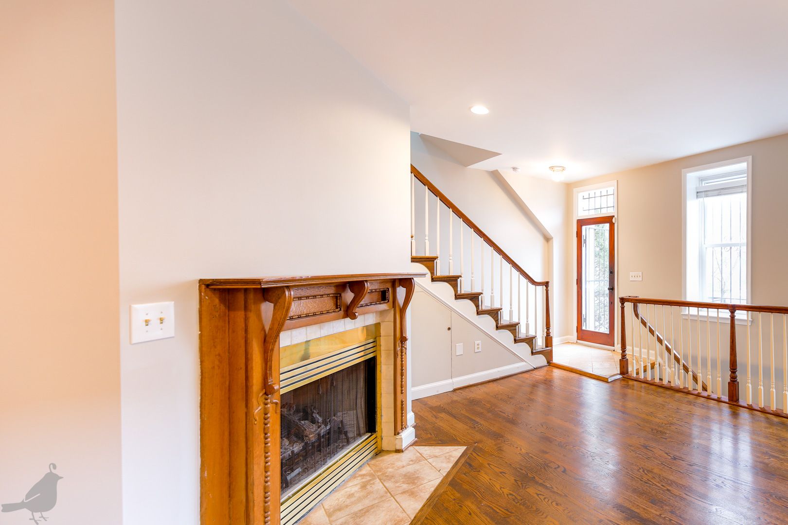 This inviting rowhouse sits on the corner a charming historic block. Beautiful hardwood floors fill the living and dining area on the first floor, and glisten with the flooding natural light. A fireplace graces this great open space, adding to the cozy and welcoming atmosphere. The updated kitchen features stainless steel appliances, granite countertops, and plenty of cabinet space. It opens up to a secluded deck that also provides access to the front yard. A half-bath completes this floor.