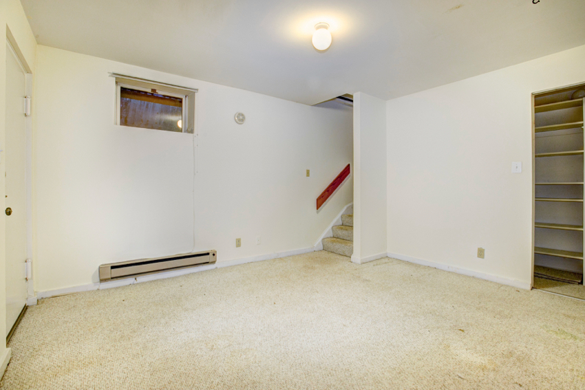The home features two bedrooms, a large finished basement, and ample closet space throughout. A full bathroom and in-unit washer and dryer add everyday convenience. One parking pass for the community lot is included.