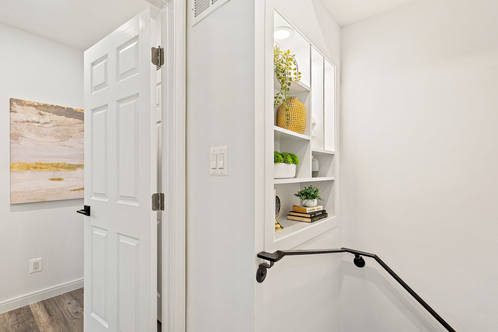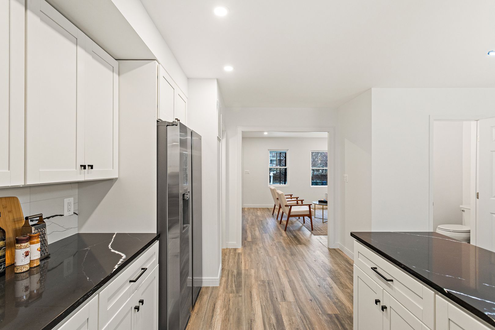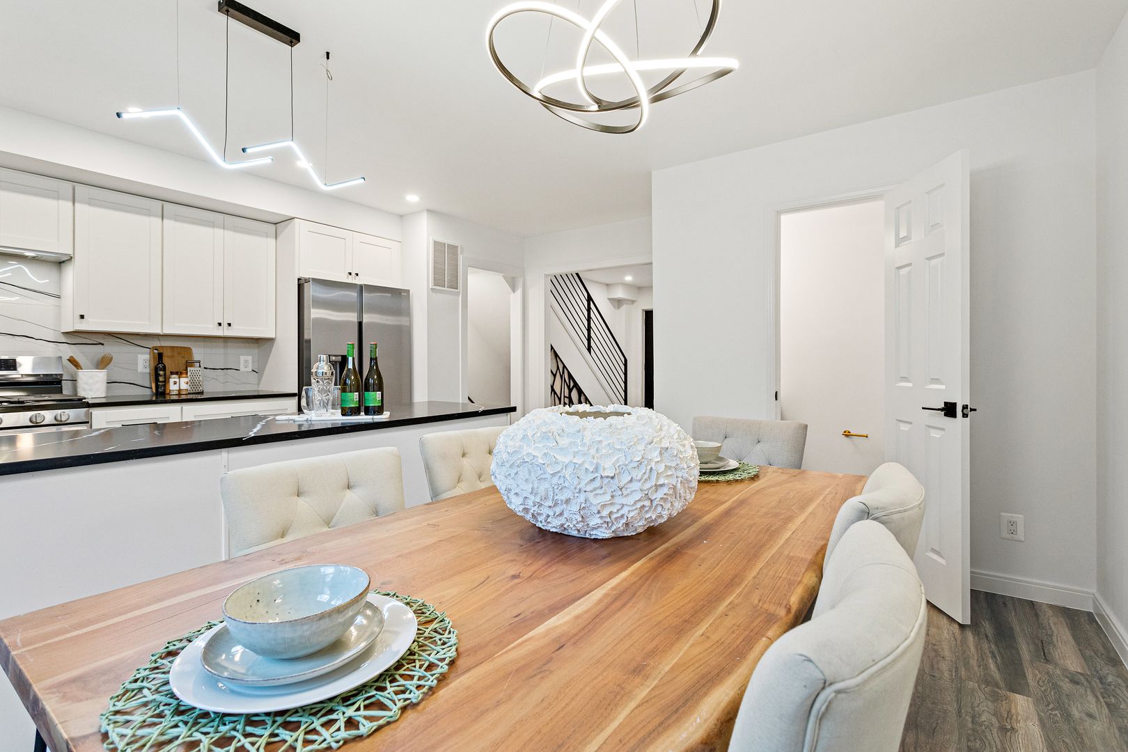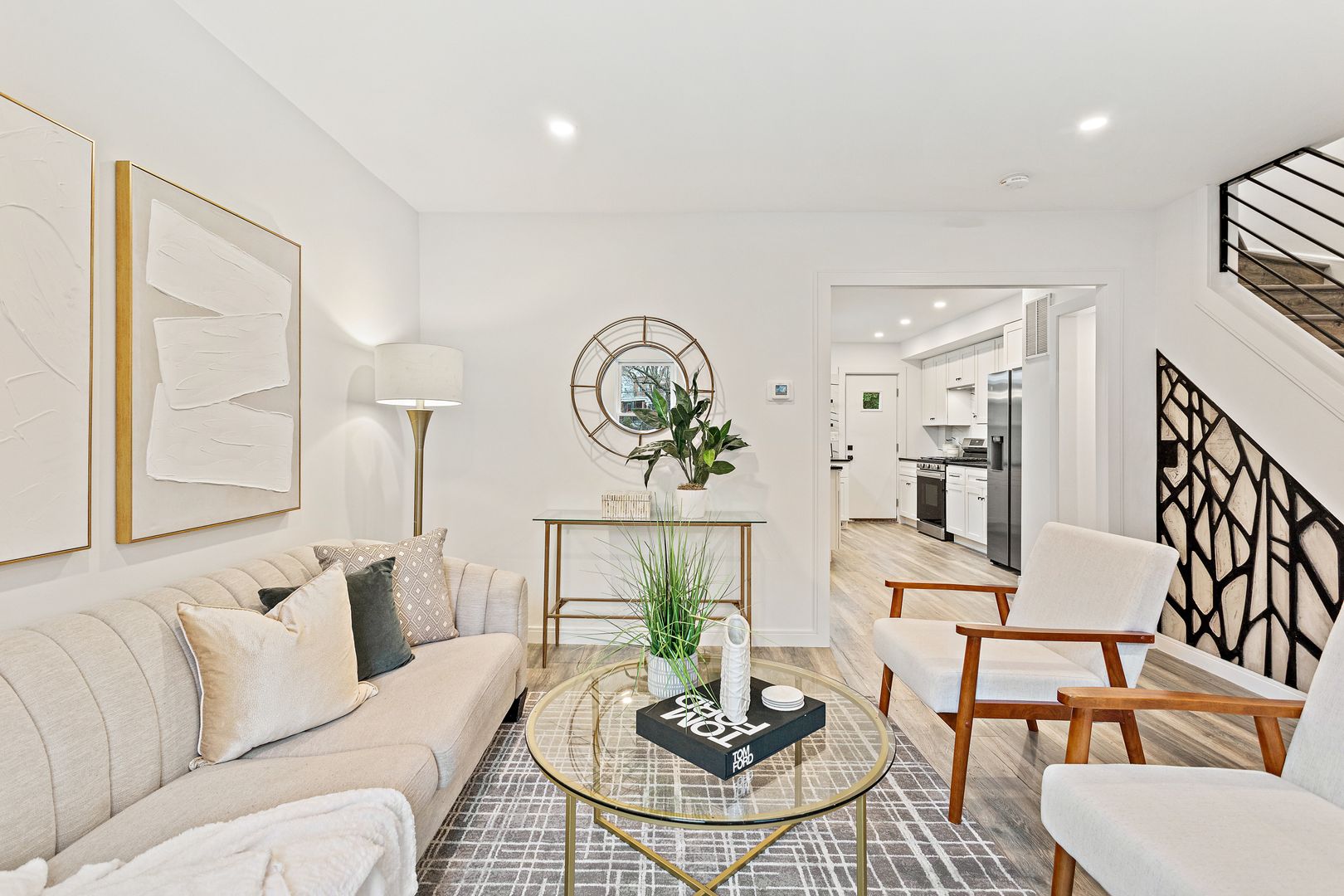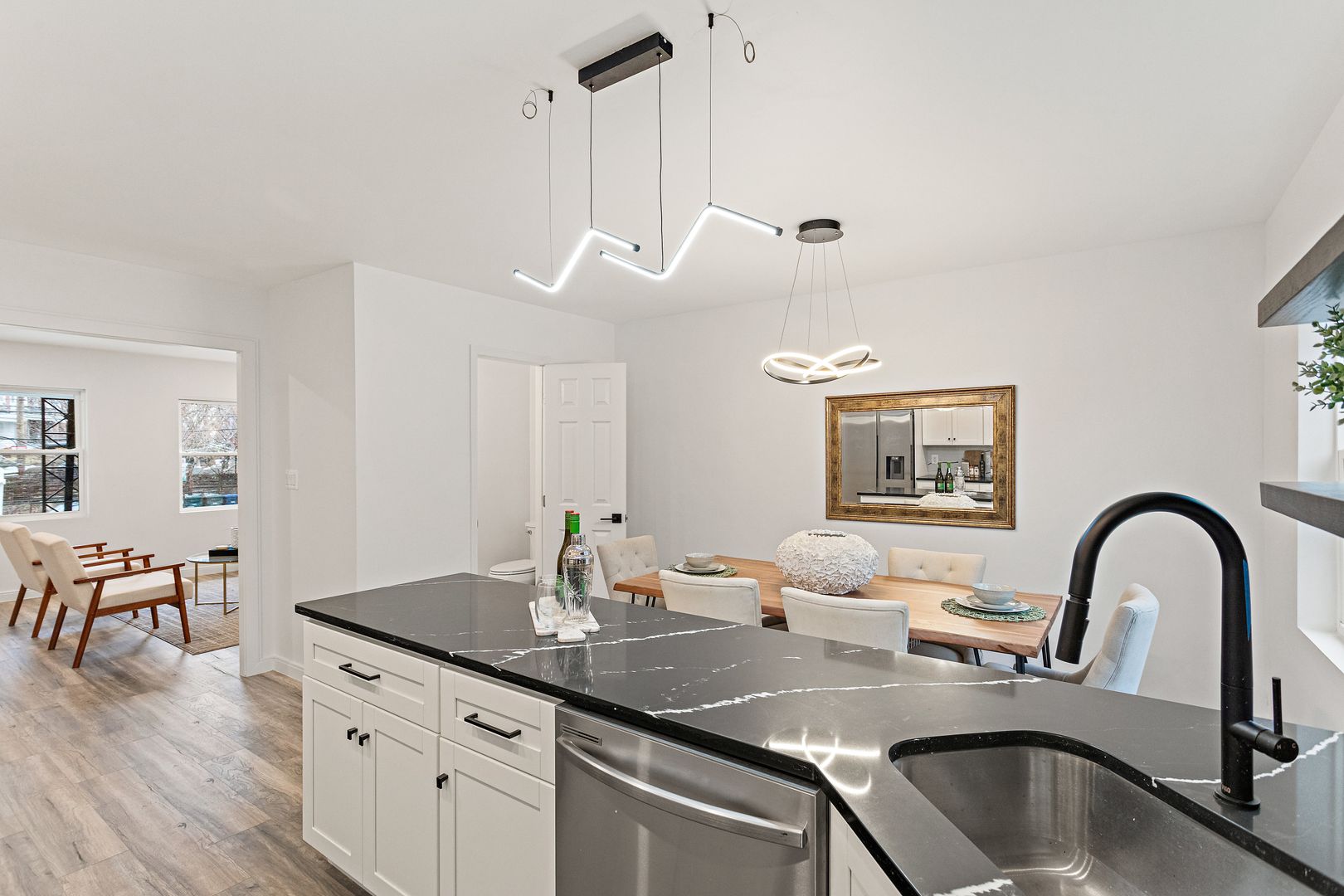 • Open layout with hardwood and tile floors.