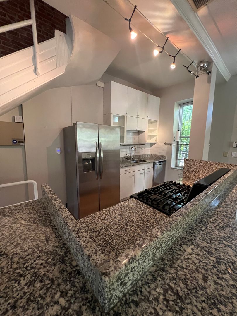 The open layout offers a spacious living area with two decorative fireplaces, perfect for cozy nights in. The kitchen is equipped with granite countertops, a gas range, stainless steel appliances, and an in-unit washer and dryer for everyday convenience.