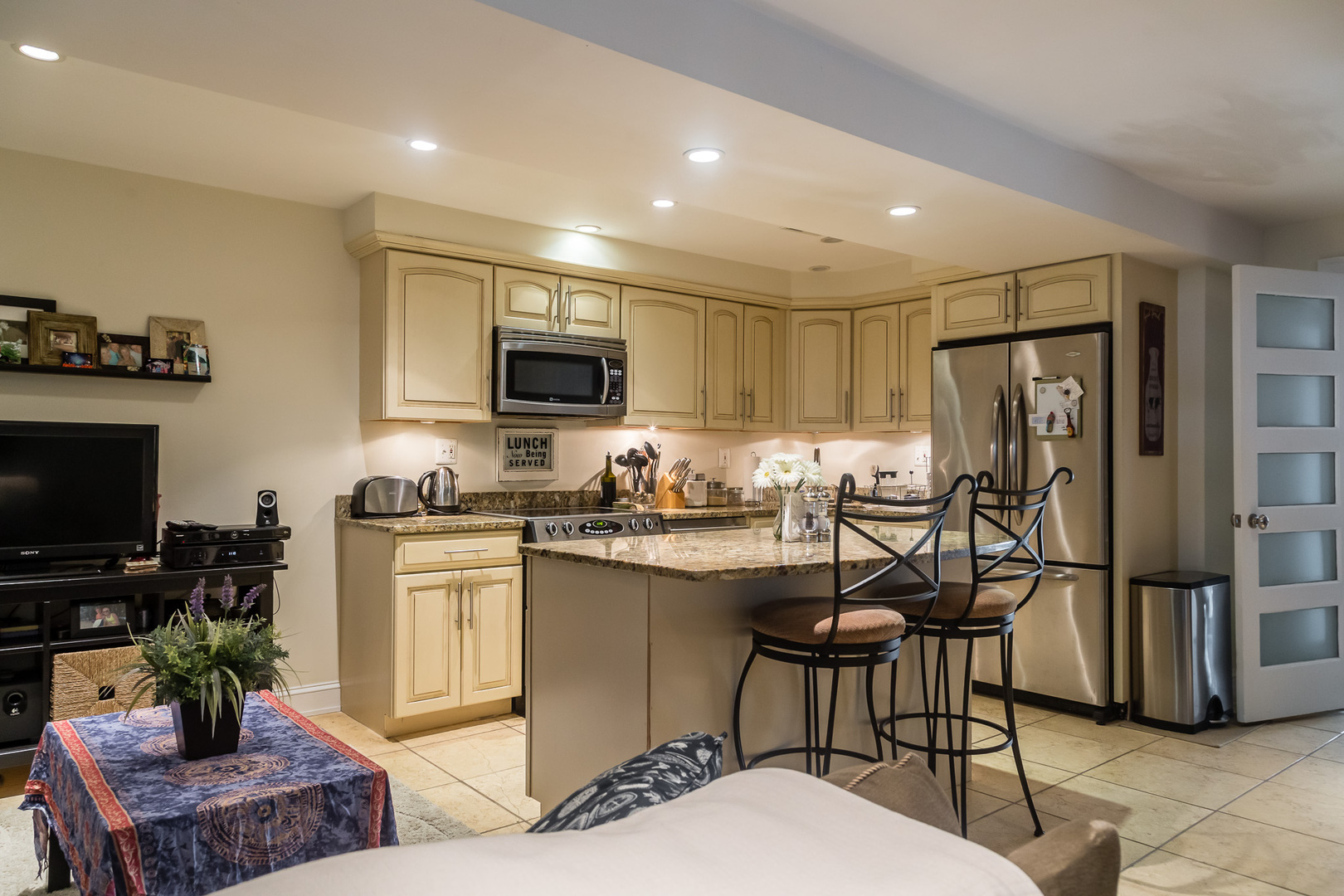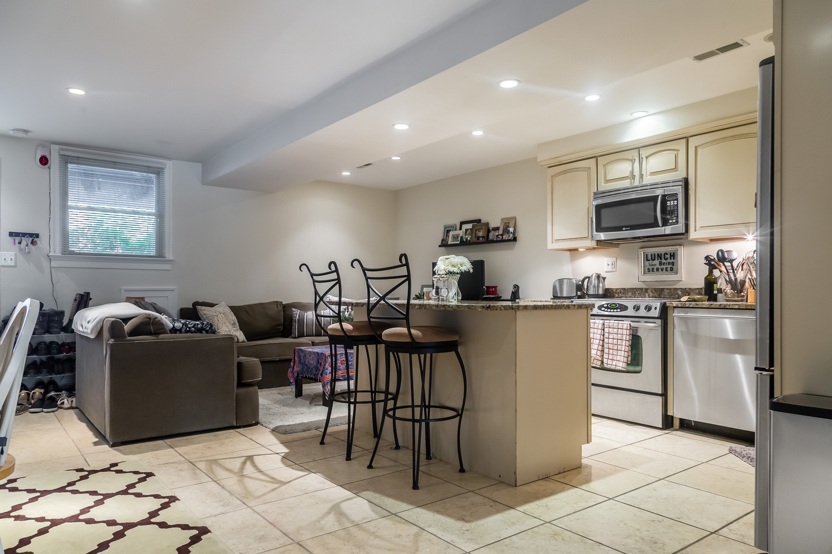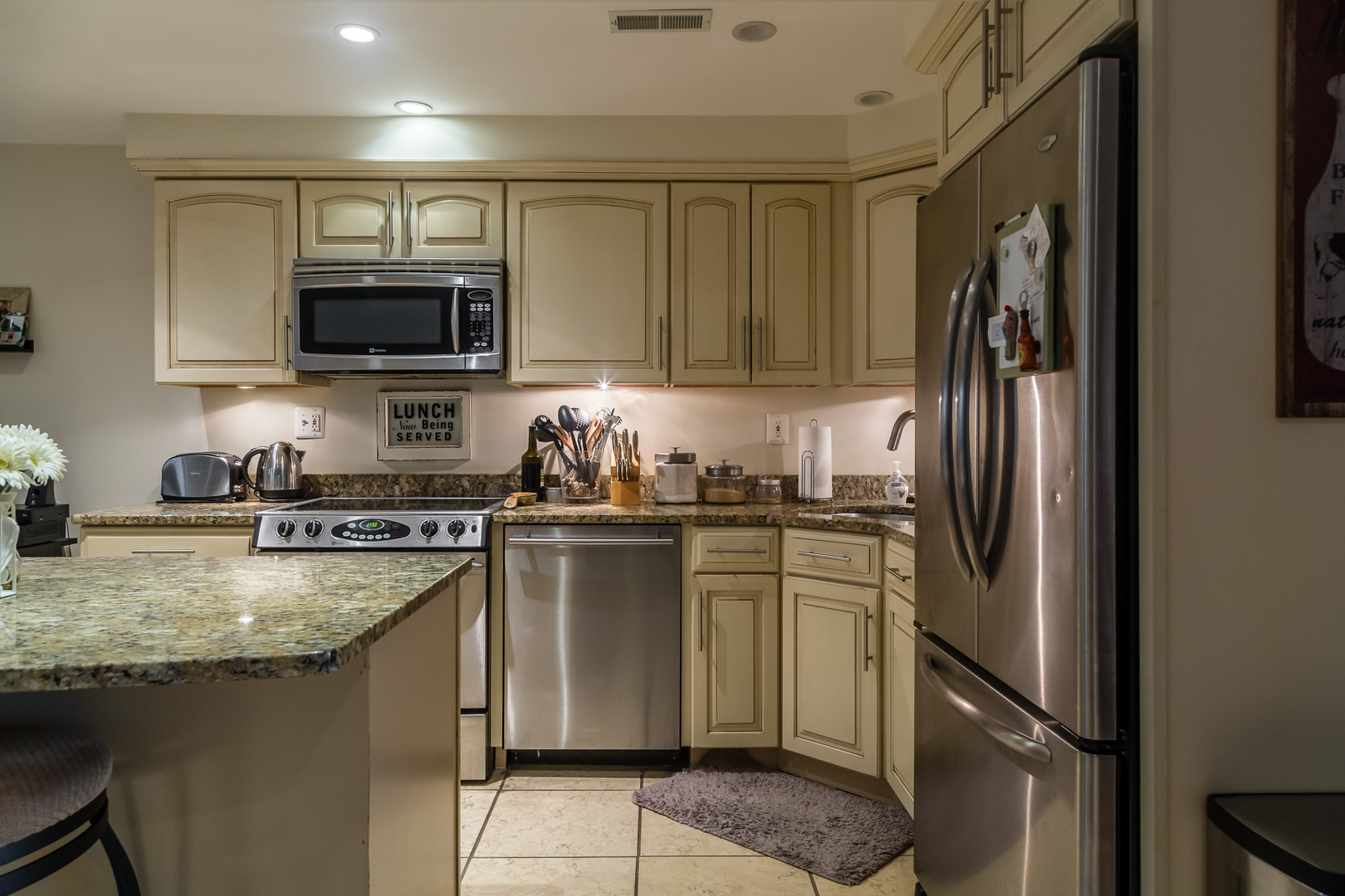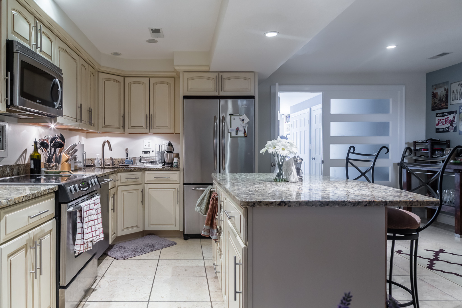 Inside, you'll find an open living area with recessed lighting and durable tile flooring that creates a bright and functional space. The spacious kitchen features an island, stainless steel appliances, granite countertops, and plenty of cabinet storage—perfect for cooking and entertaining.