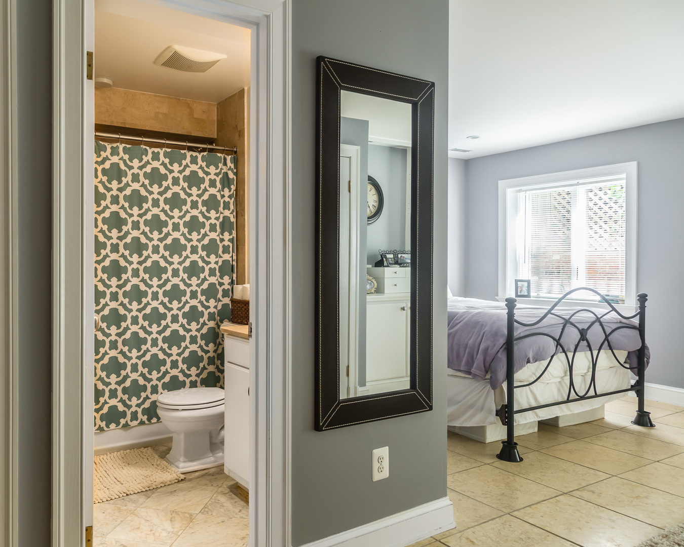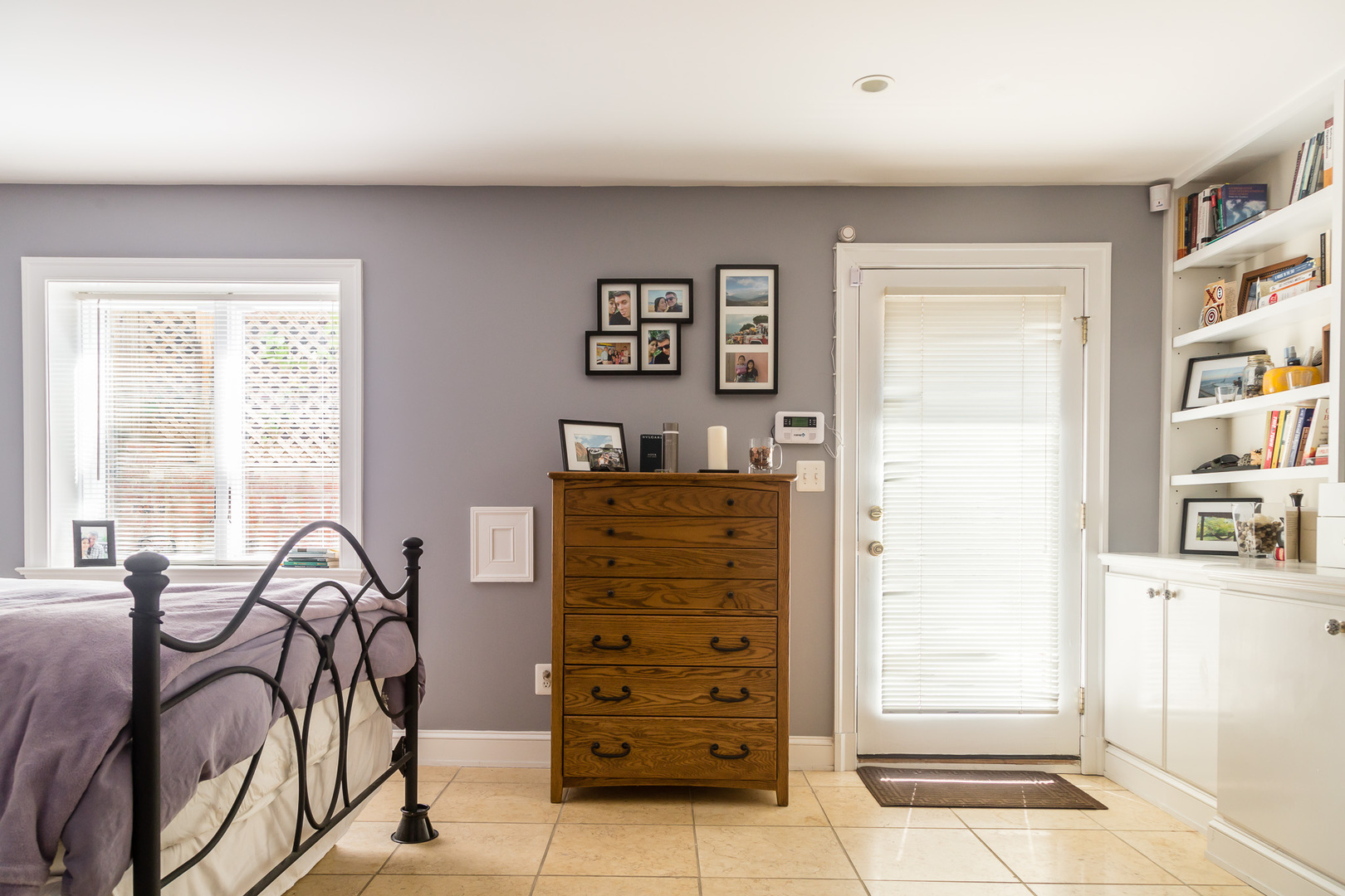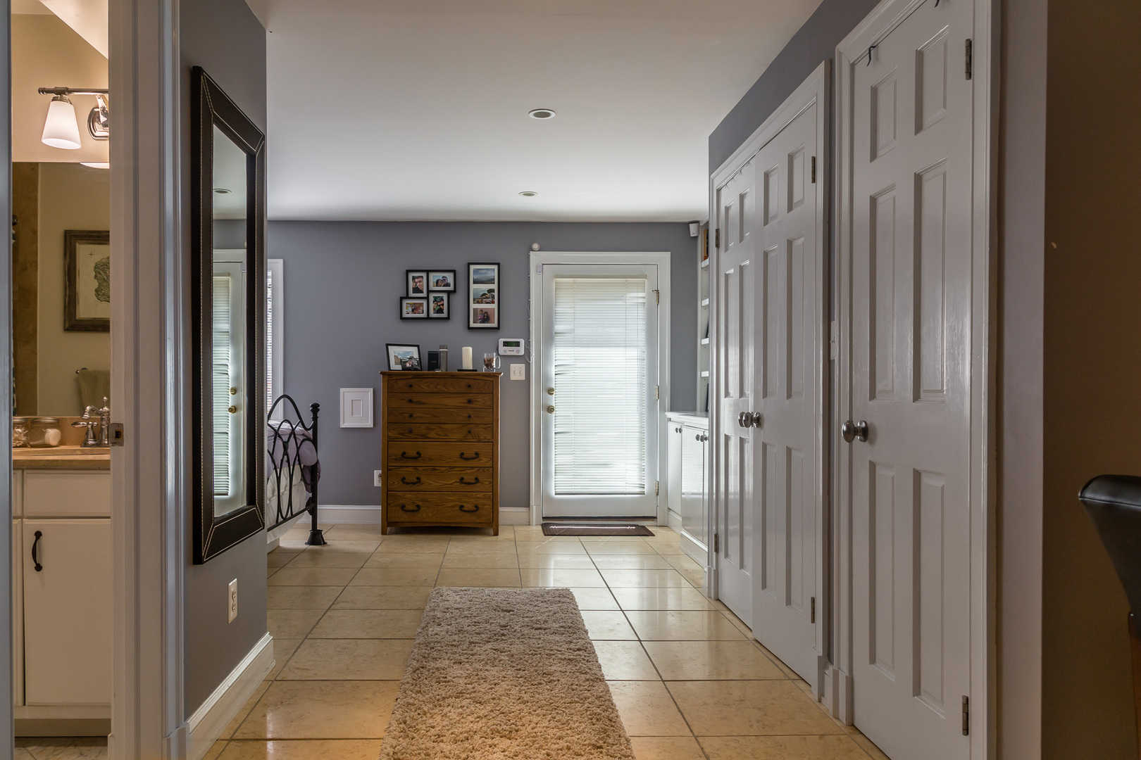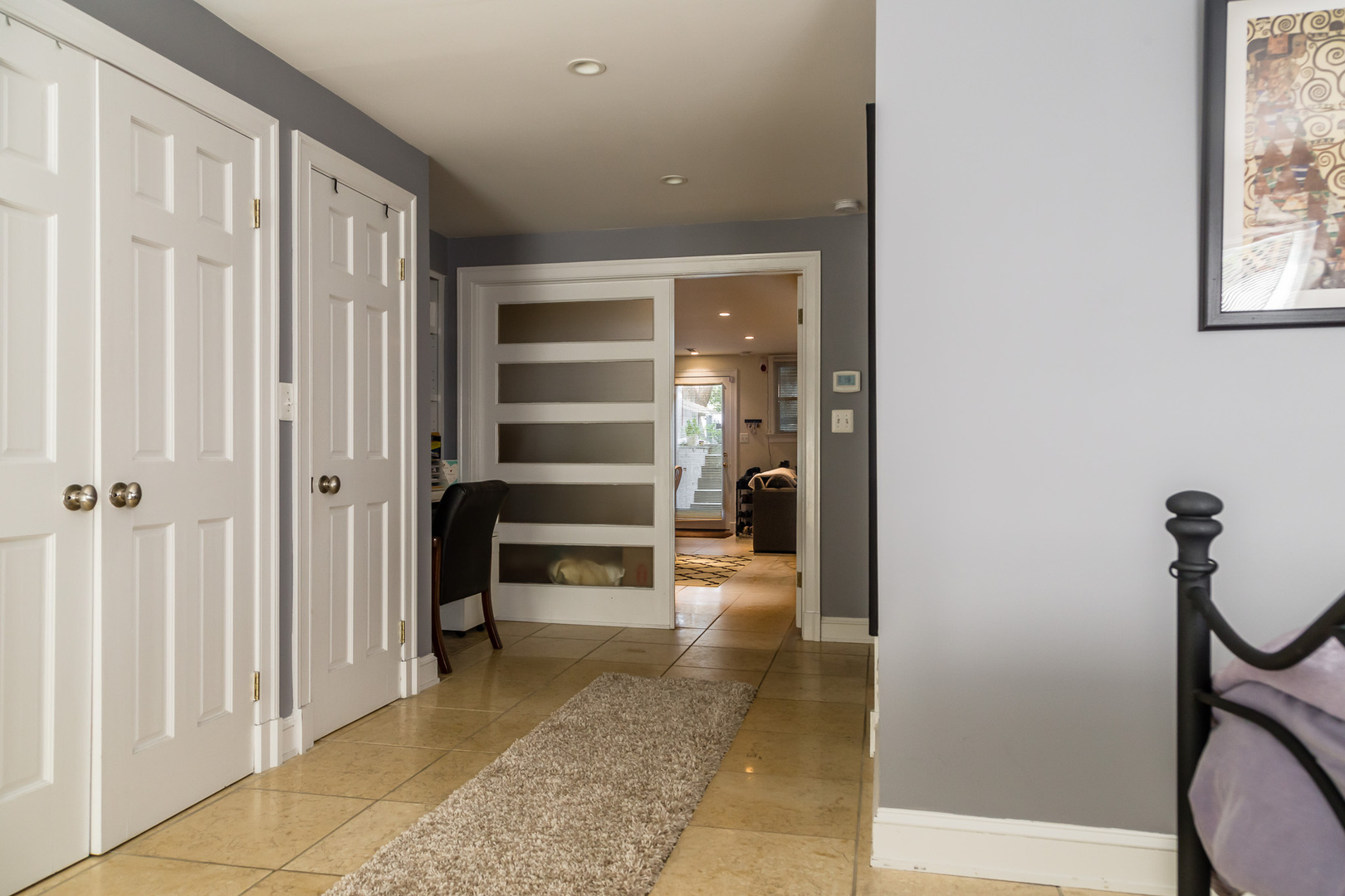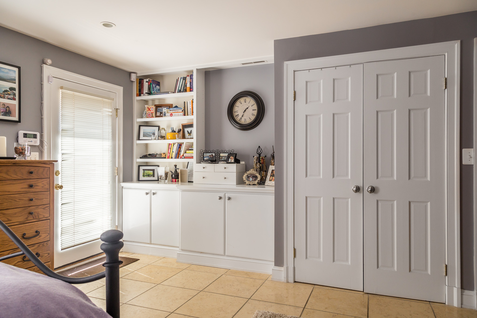 Along the hallway, you'll find a convenient office nook that works well for remote work or additional storage. French doors lead into the generously sized bedroom, which includes built-in shelving and a closet for added organization.