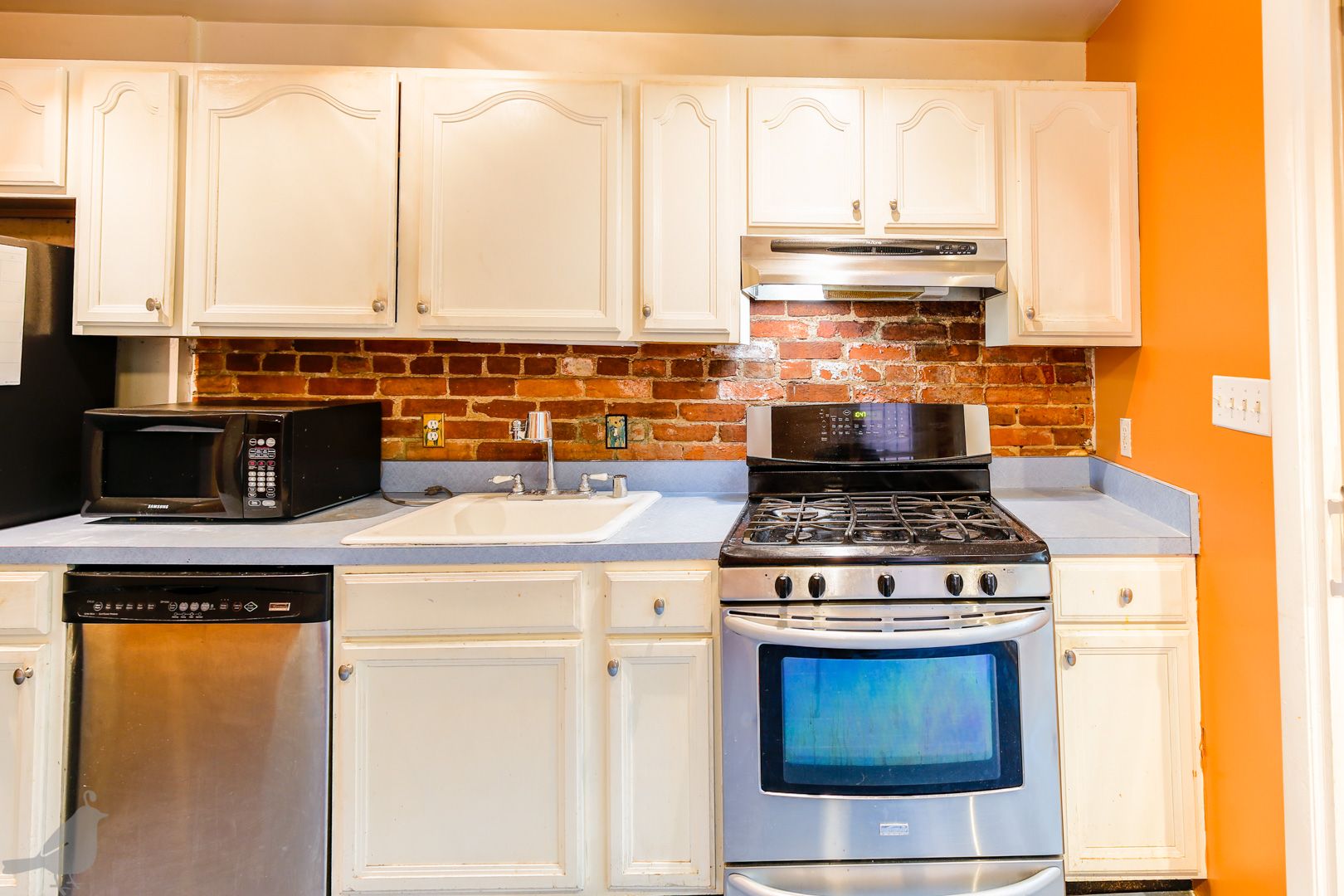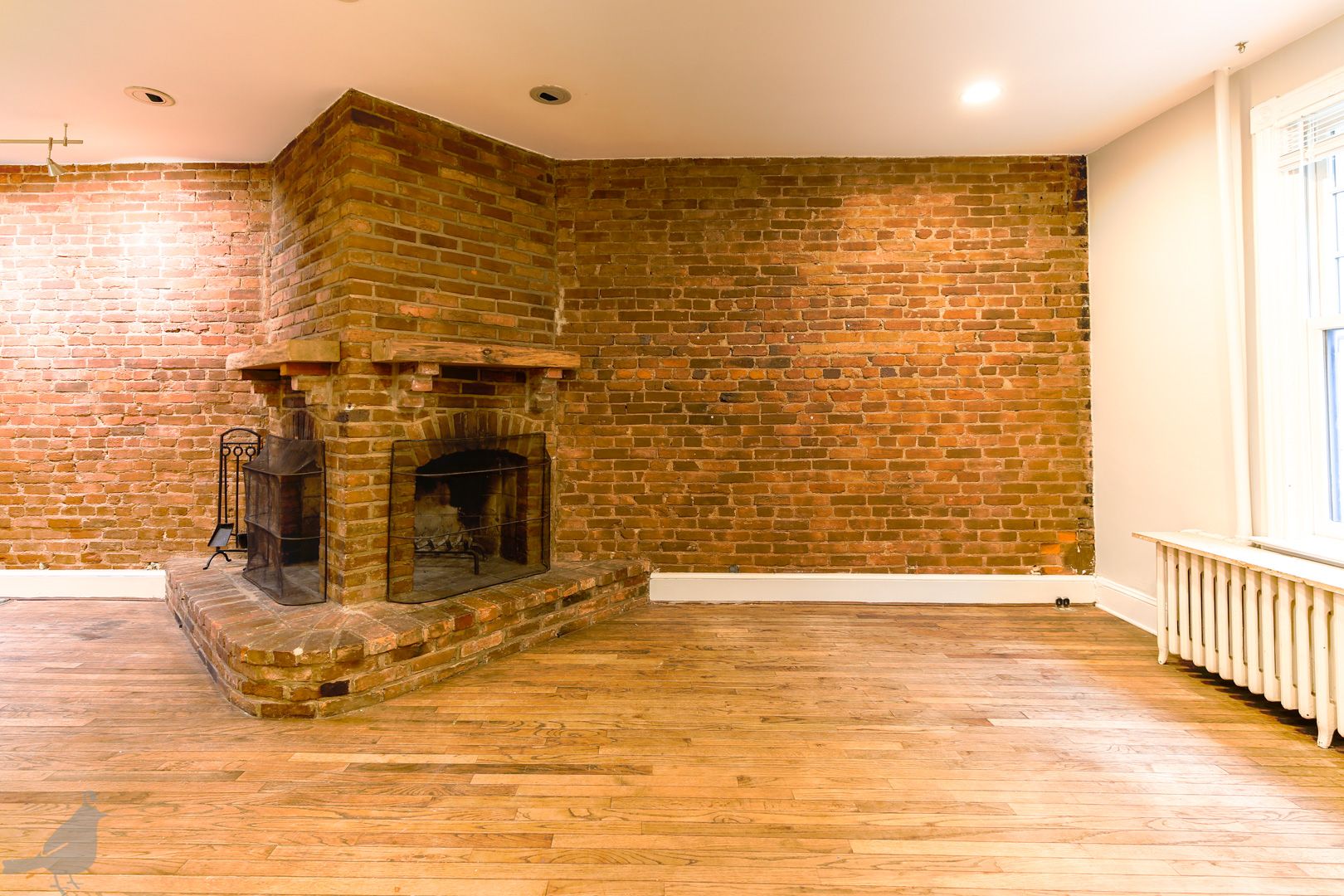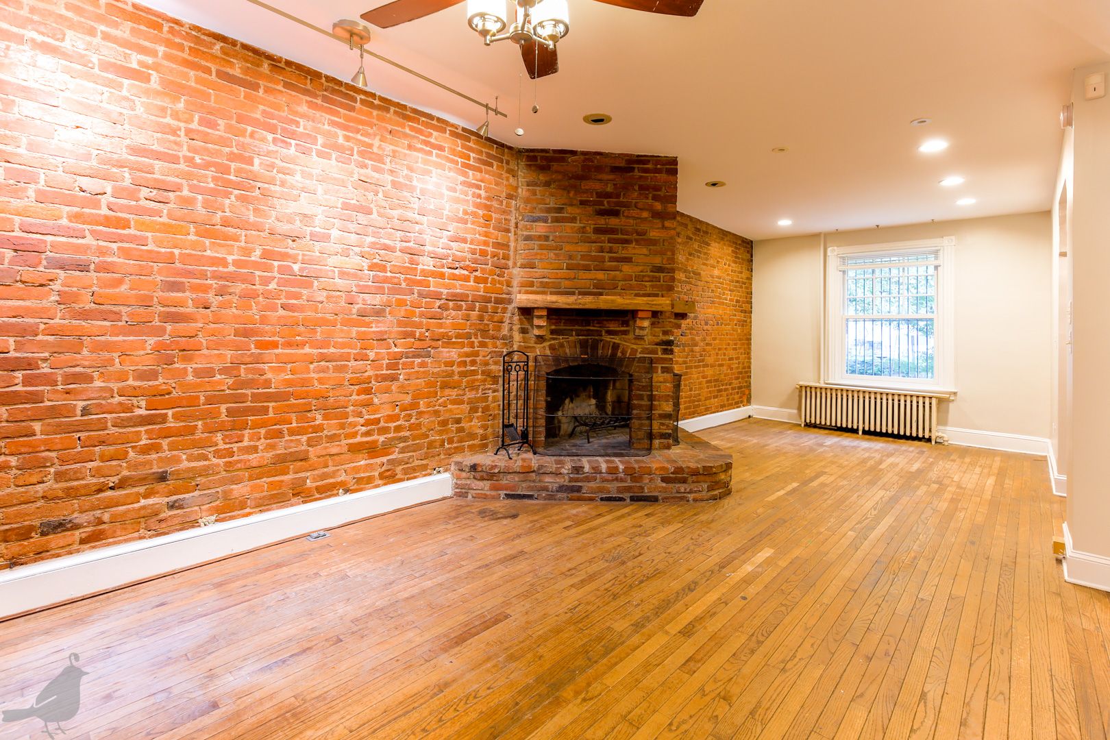 Enjoy the welcoming front porch, perfect for relaxing mornings and evenings. Inside, you’ll find a spacious living room with exposed brick walls and an eye-catching double-sided decorative fireplace that anchors both the living and dining areas. (Fireplace is decorative only and not operational.)