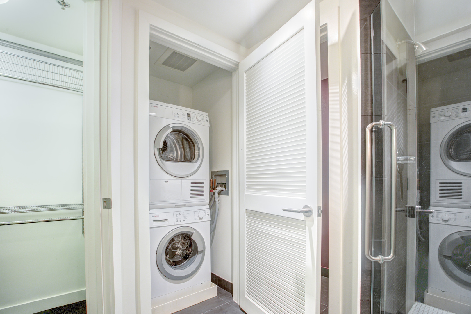 Upstairs, retreat to the lofted bedroom area, offering privacy and comfort with blackout curtains, a full en-suite bathroom with a glass-enclosed shower, and a custom walk-in closet with a stacked washer and dryer.