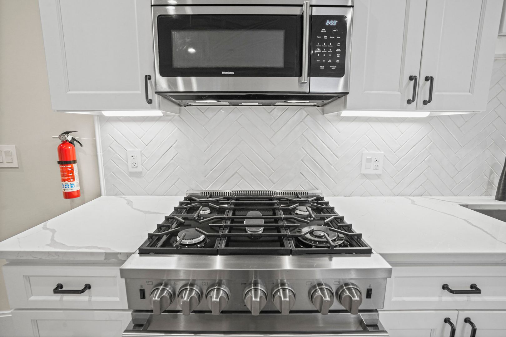 • Spacious kitchen with plenty of cabinet storage, white countertops, and stainless steel appliances