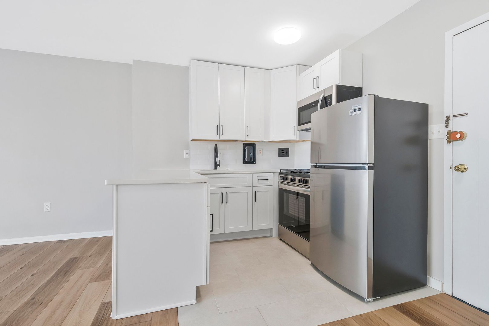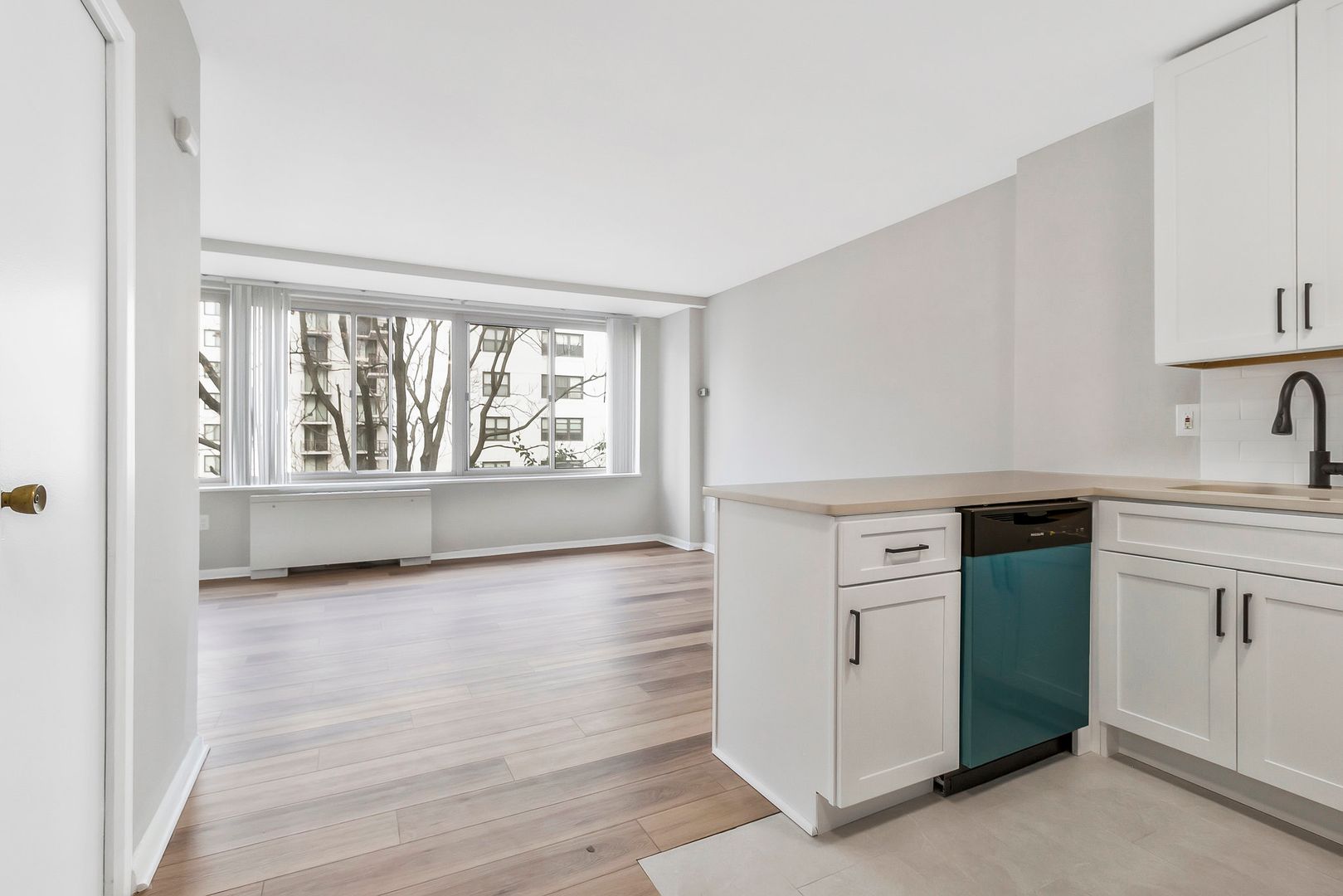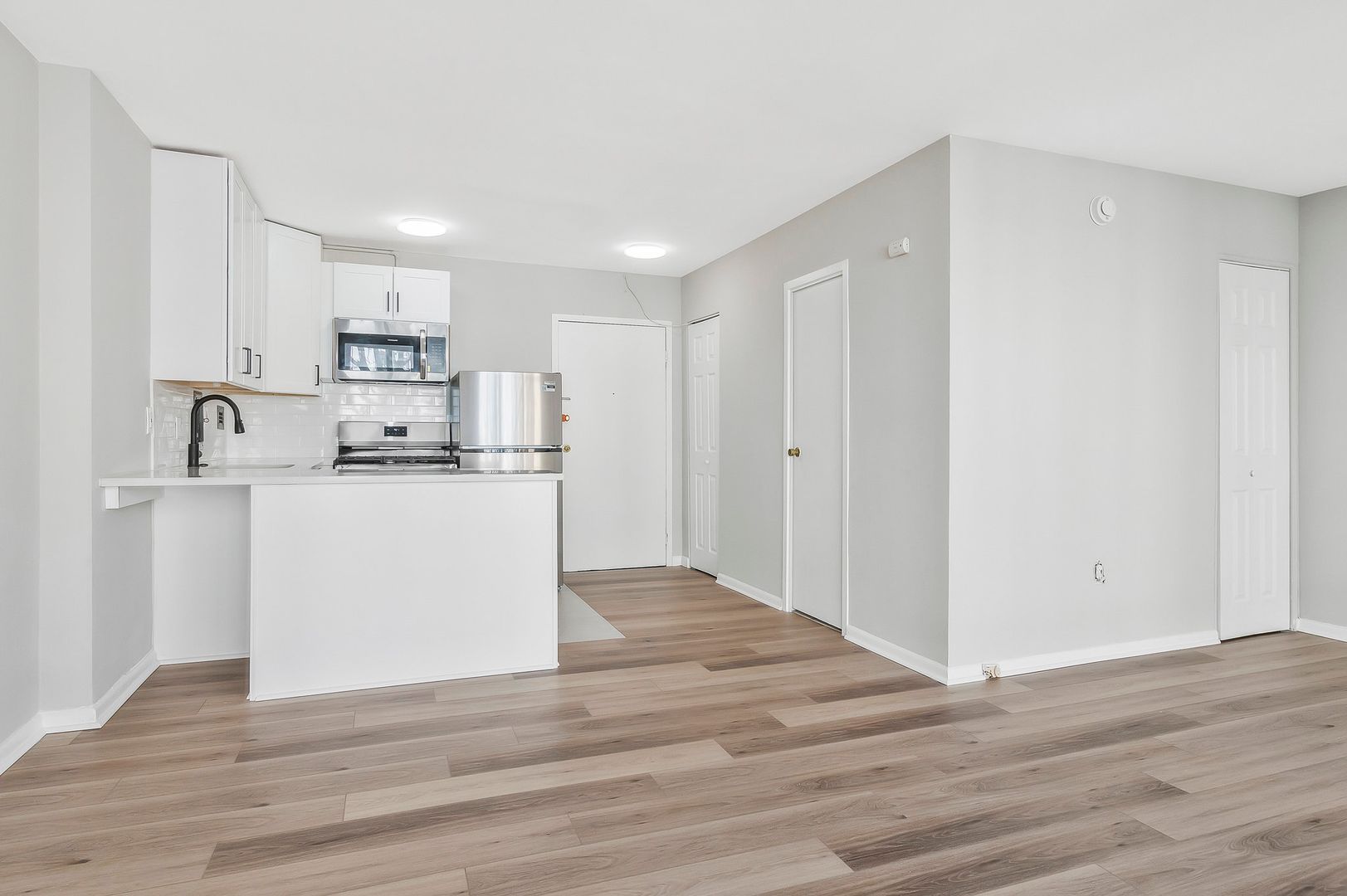 The unit features hardwood floors and large windows that bring in abundant natural light, creating an open and airy feel. The kitchen has been recently renovated and includes ample cabinet space and full-size appliances. A separate dining area offers flexibility and can easily be used as a home office or a semi-private sleeping nook.