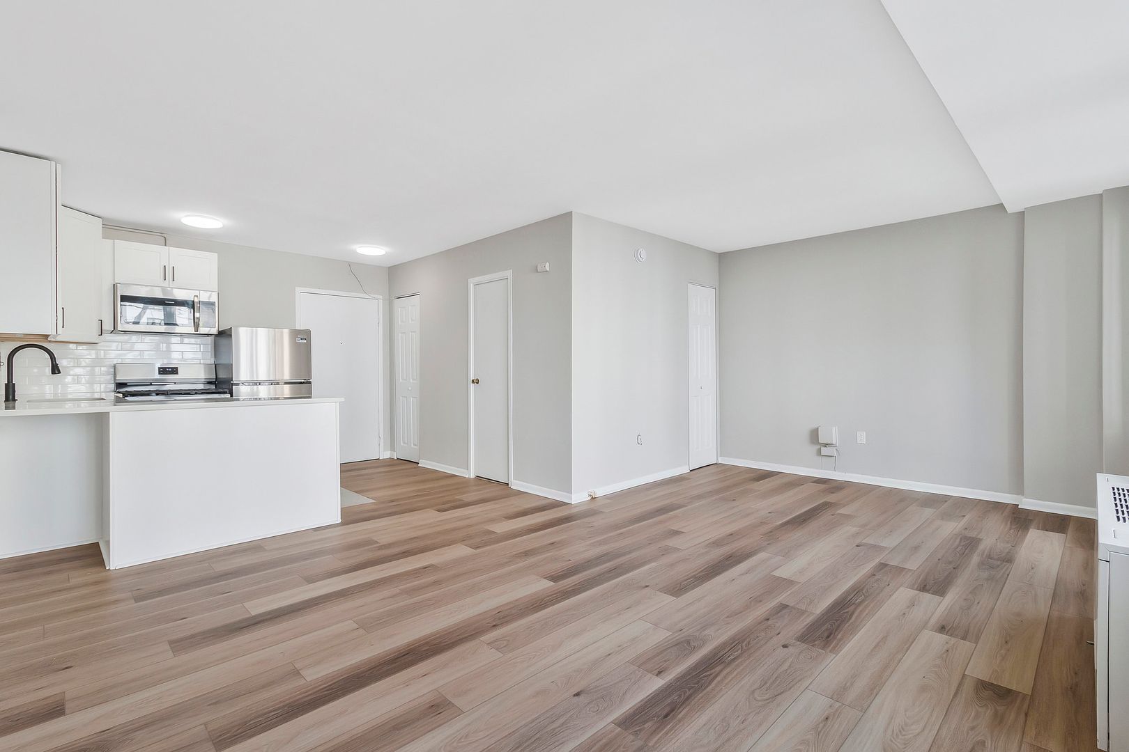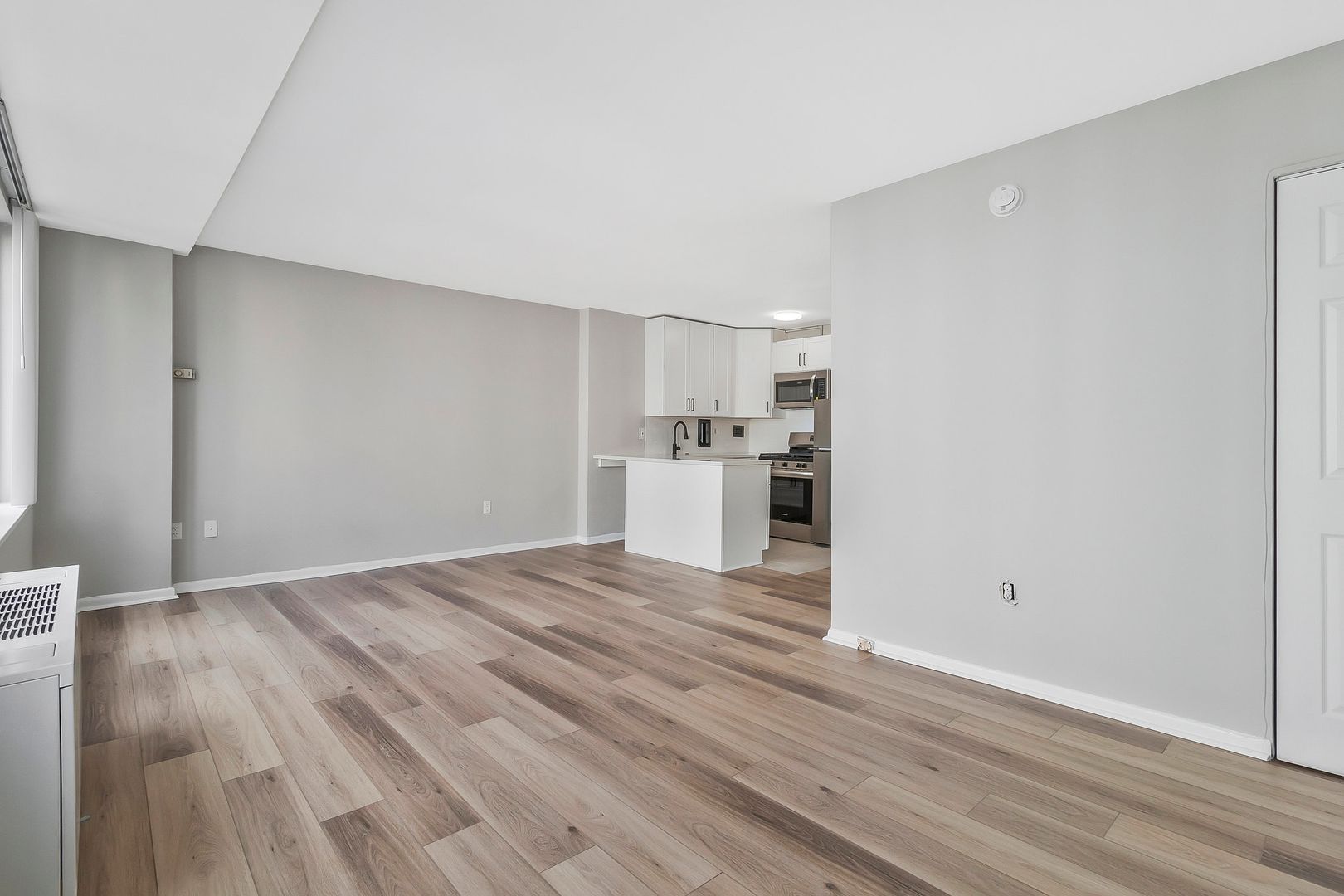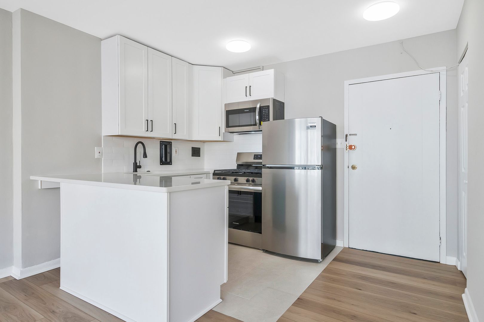 The unit features hardwood floors and large windows that bring in abundant natural light, creating an open and airy feel. The kitchen has been recently renovated and includes ample cabinet space and full-size appliances. A separate dining area offers flexibility and can easily be used as a home office or a semi-private sleeping nook.