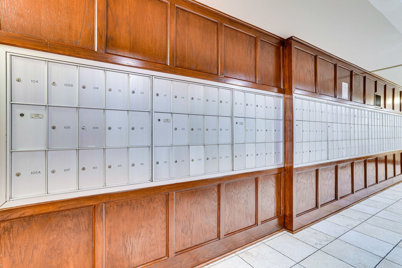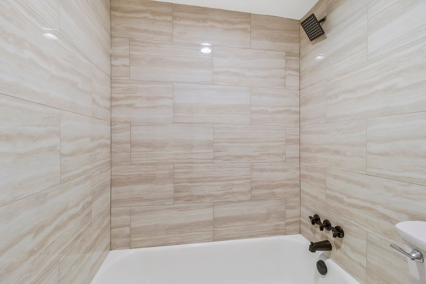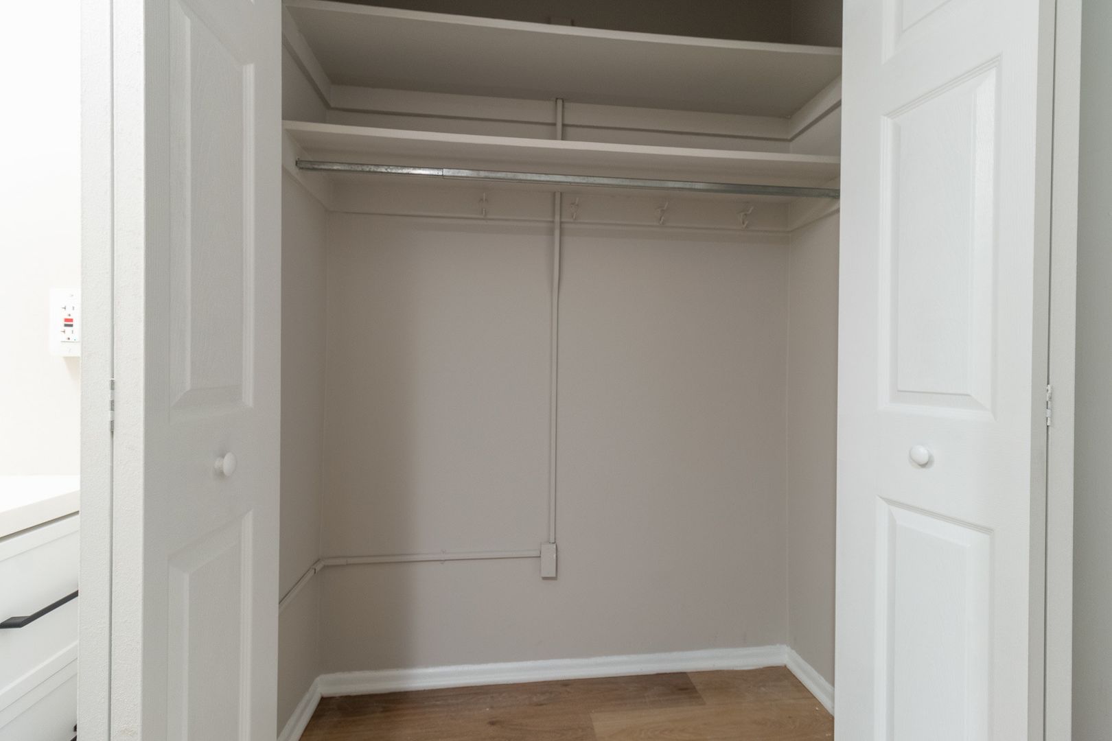 A spacious closet with built-in shelving leads to the bathroom, which includes a shower/tub combo. Residents also enjoy access to a building pool and a convenient laundry room on the first floor.