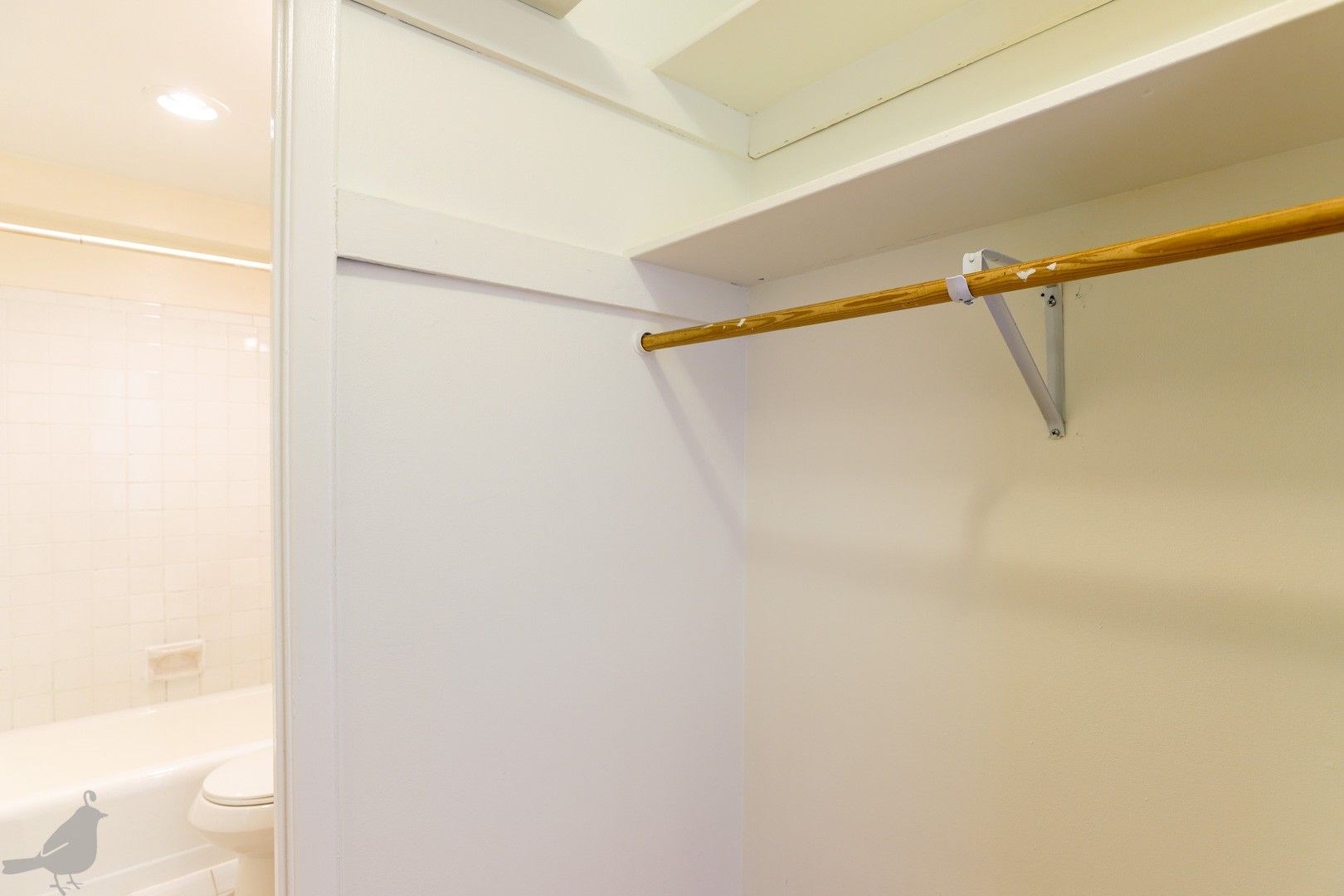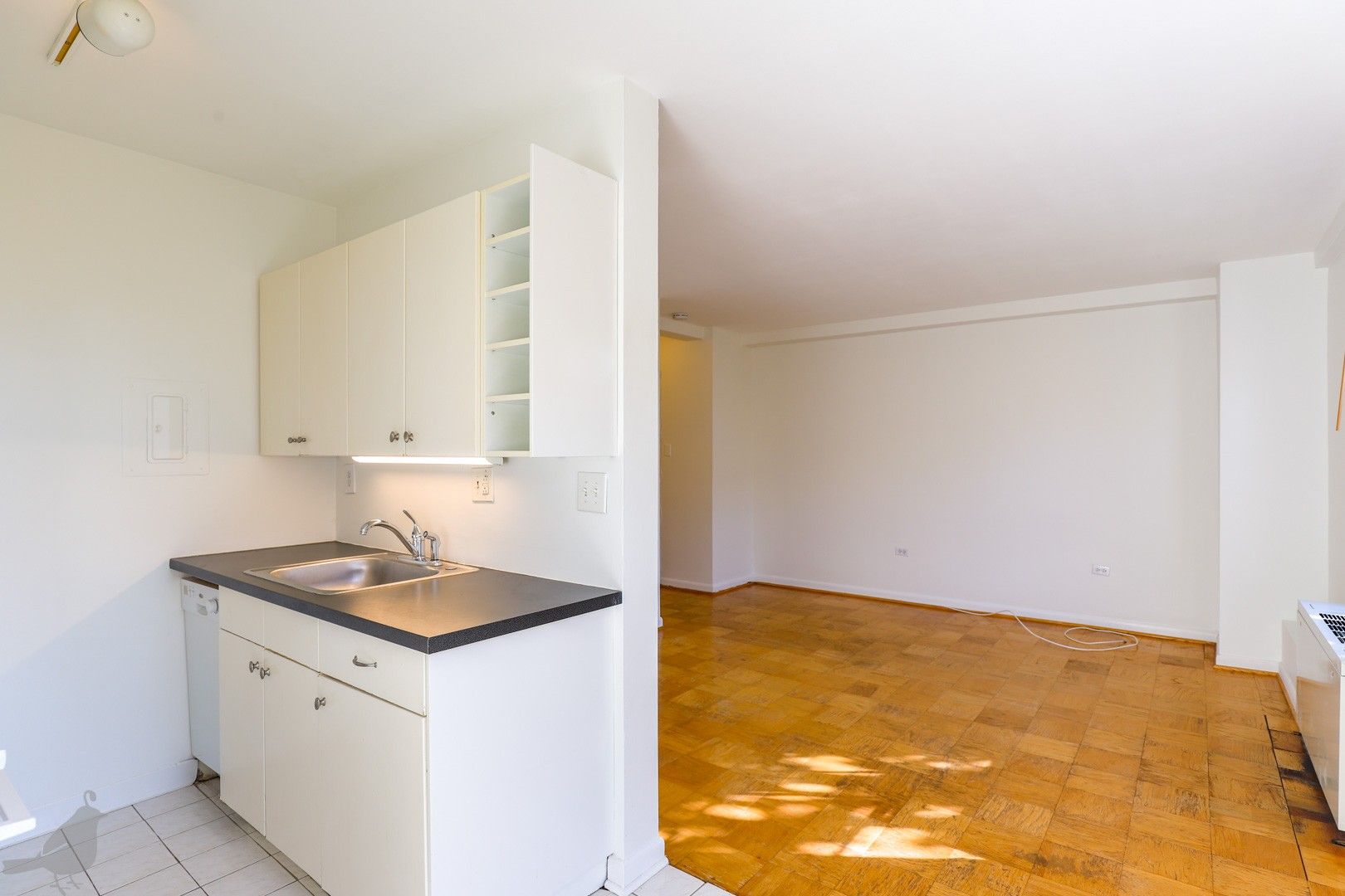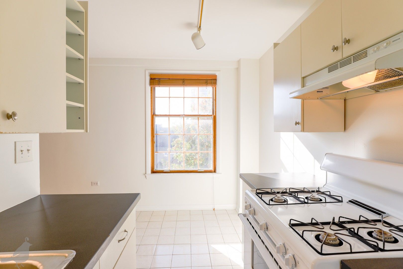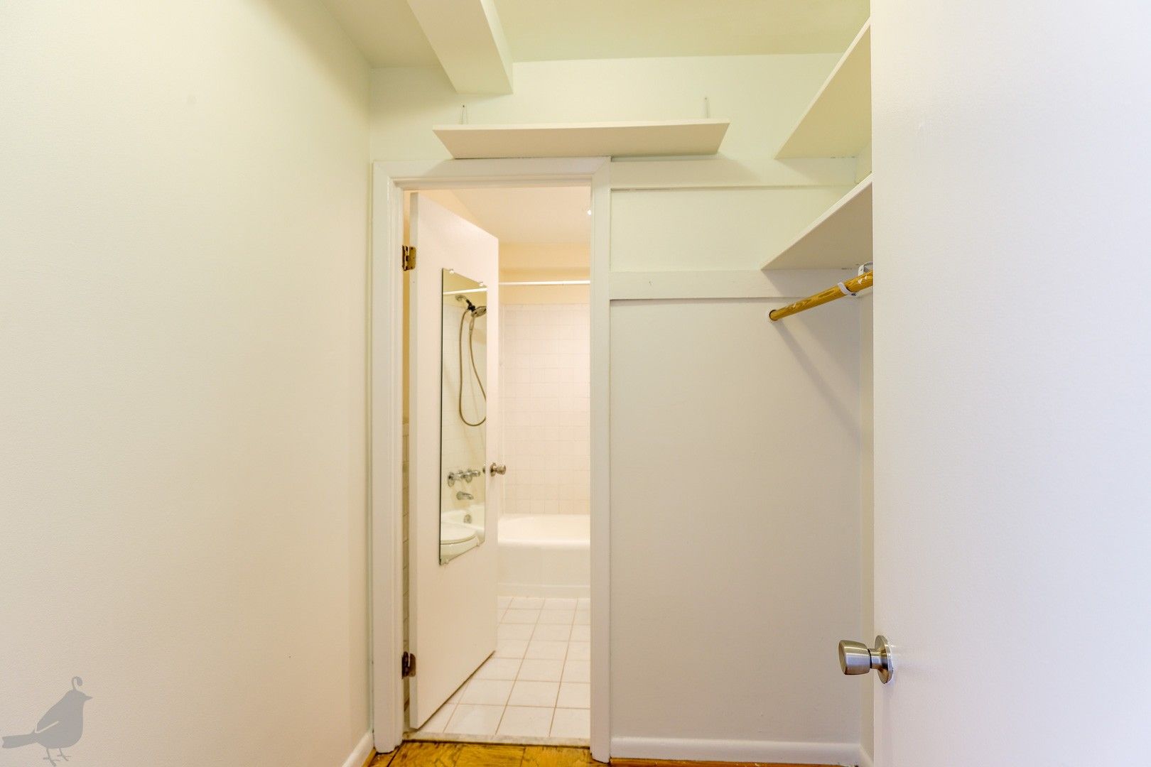 Enter into a light-filled living space featuring parquet floors and great natural light. The kitchen offers ample cabinet space, a gas range, and functional layout for everyday cooking. A spacious walk-in closet leads to a classic bathroom with a full-size tub and pedestal sink—perfect for relaxing at the end of the day.