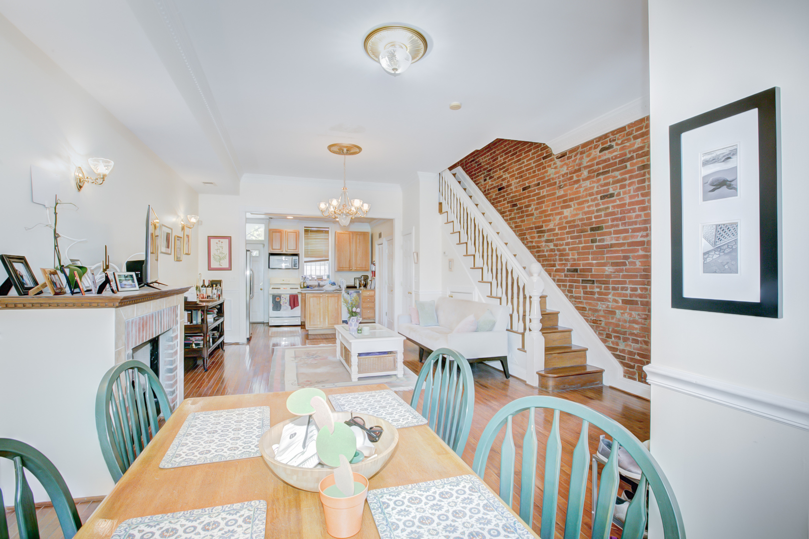 Hardwood floors run throughout the home, complemented by abundant natural light and exposed brick that add character and warmth. The first floor welcomes you into a spacious living area with plenty of room for both a full living room and dining setup. Elegant lighting fixtures and a decorative fireplace add extra ambiance.