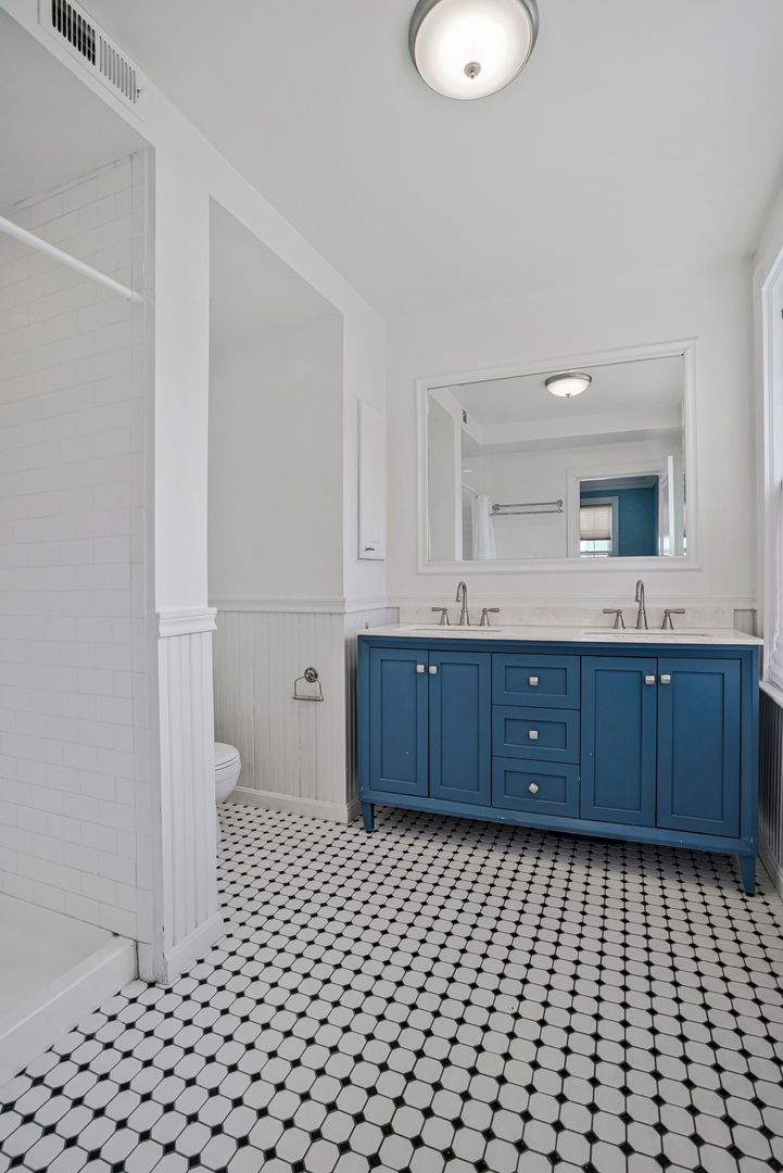 On the second floor, you’ll find three bedrooms and two bathrooms-- including the main suite-- each with tons of space and natural light. The main bedroom faces the front of the home and features high ceilings and a stylish ensuite bathroom, complete with lovely tile, brass fixtures, and a gorgeous vanity. Head downstairs to the finished basement, with a spacious living area perfect for hosting a game or movie night, and another bedroom. You will find your next washer and dryer here!